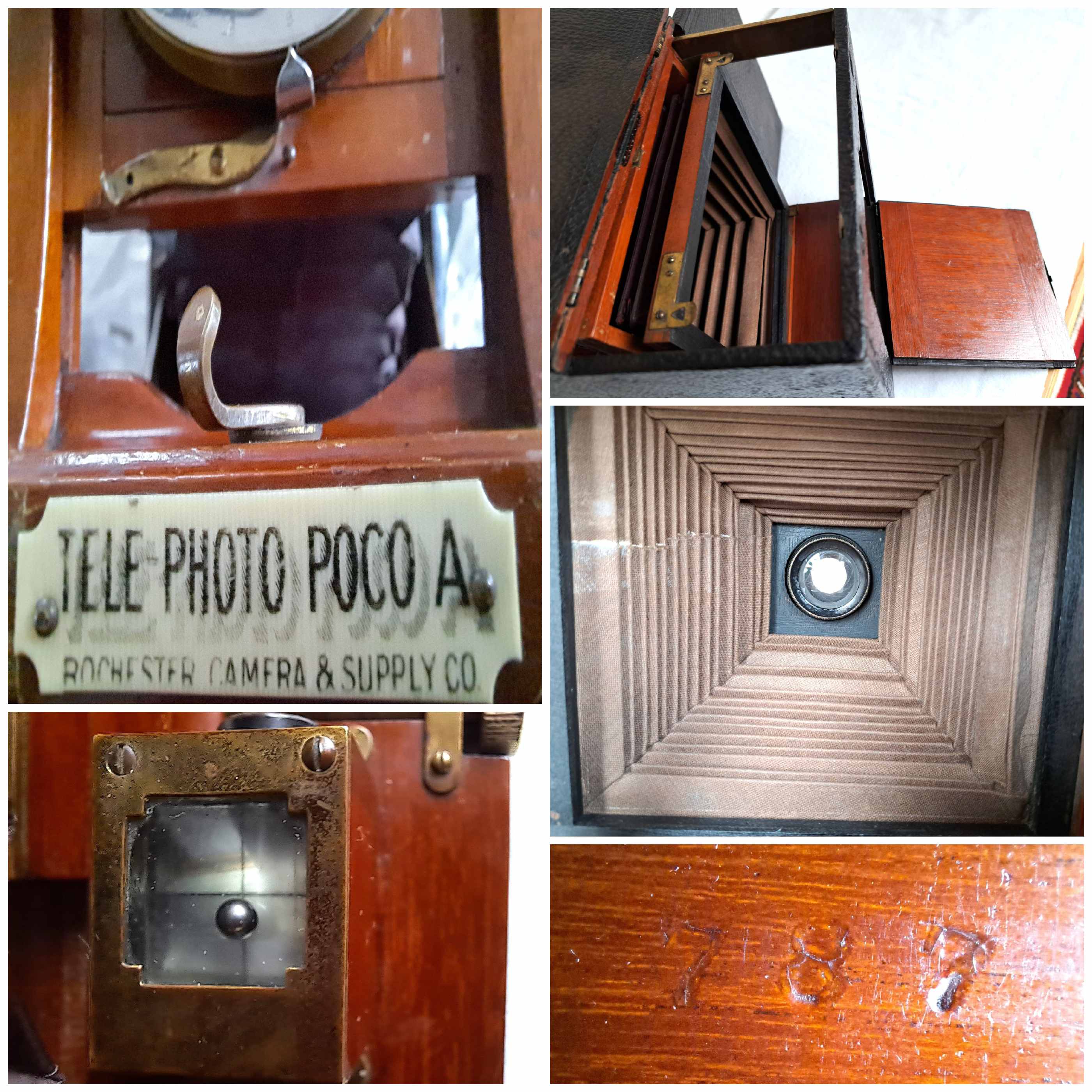 Als ich die Kamera in den Händen hielt war ich von der ausladenden Größe beeindruckt. Dabei wirkt sie sehr grazil mit ihren wunderbaren Holzarbeiten. Das Chassis der Tele-Photo Poco A besteht aus poliertem Mahagoni, ist mit poliertem und lackiertem Messing verziert und die Außenseite ist mit feinem Rindsleder überzogen.