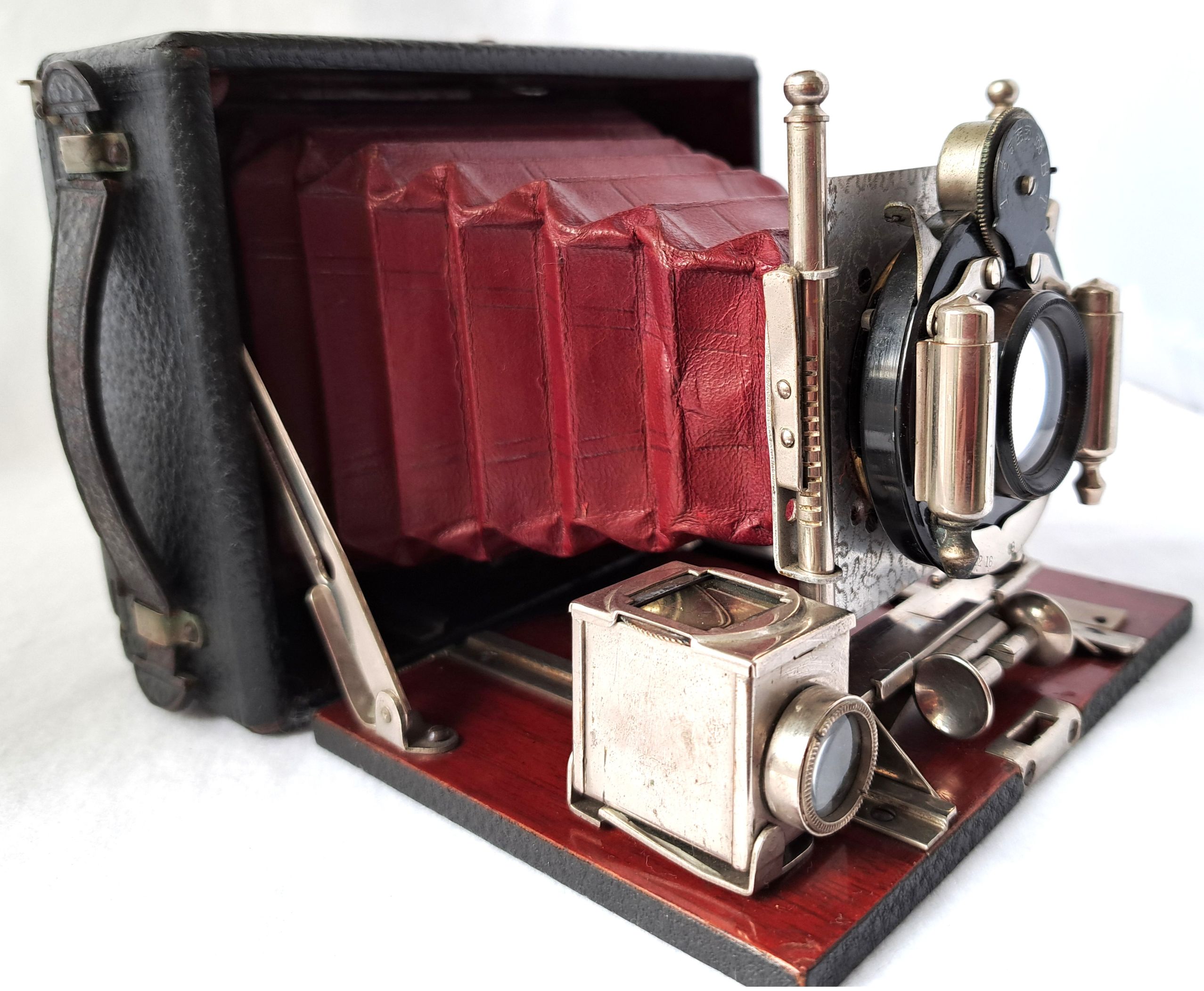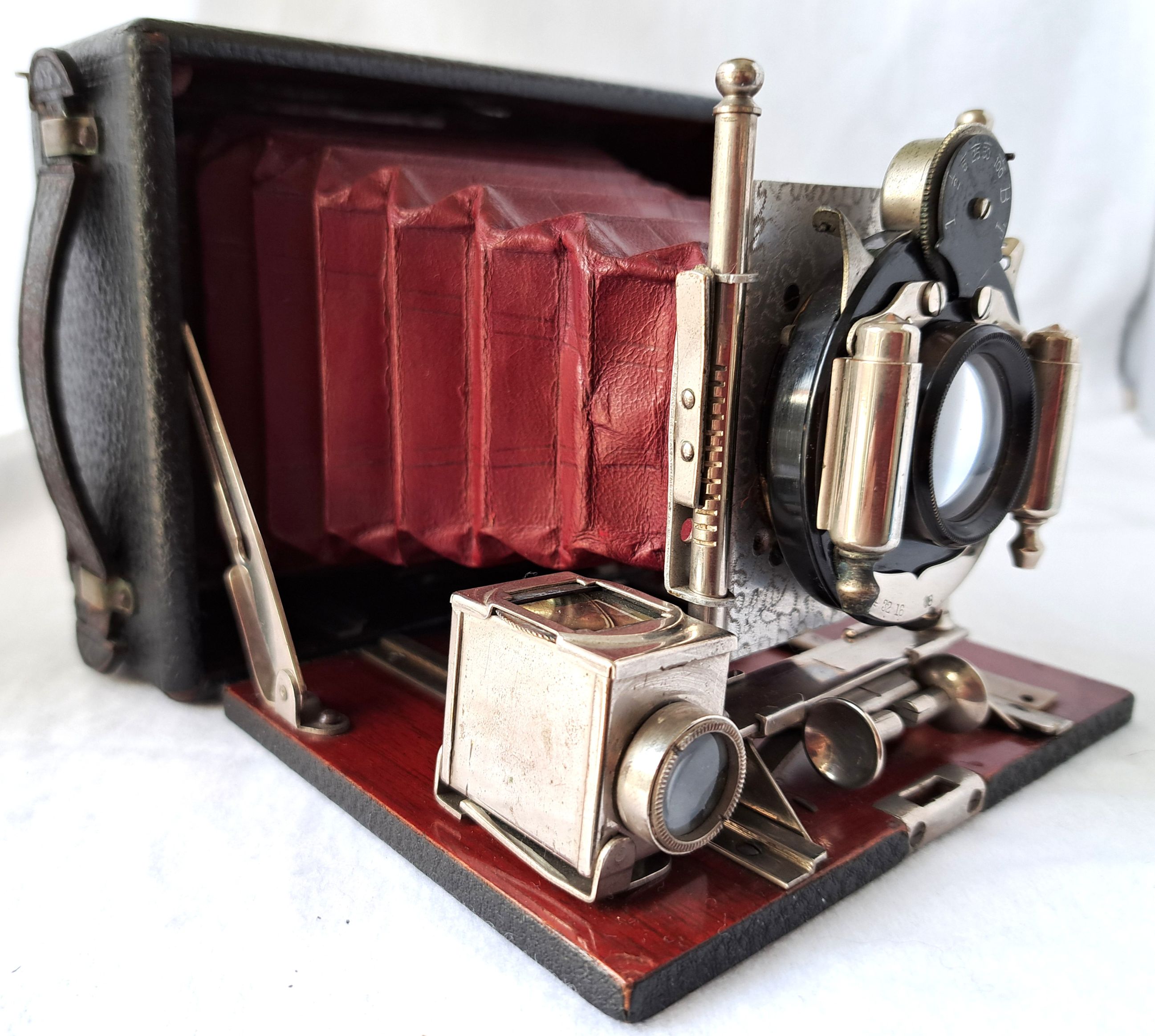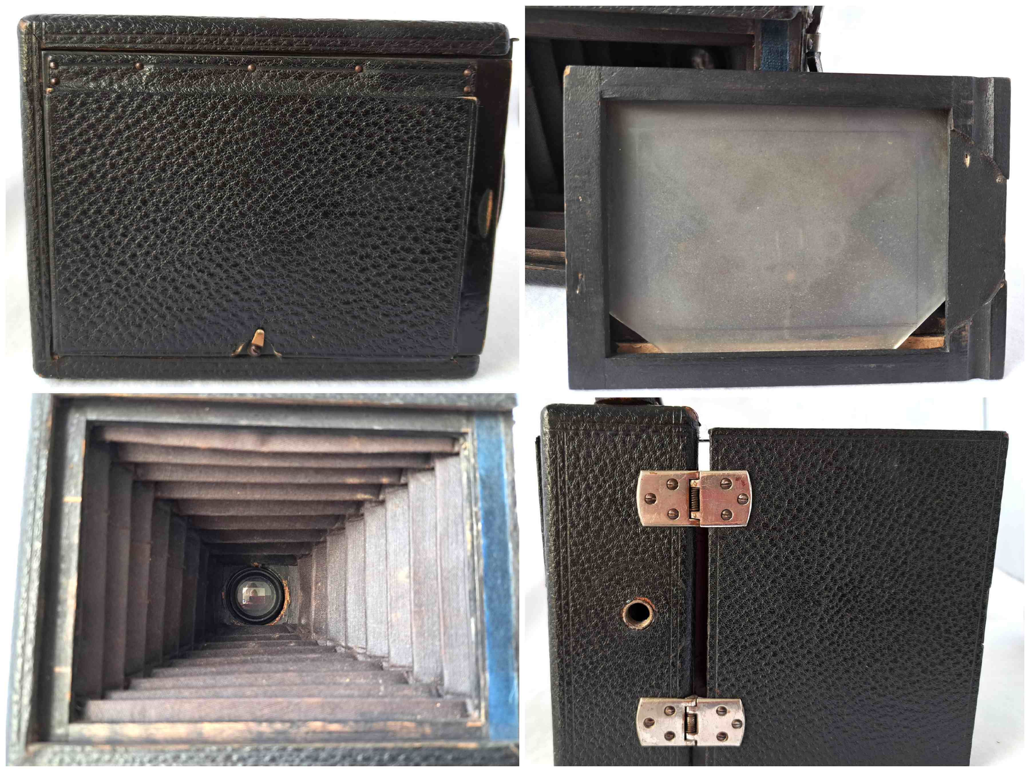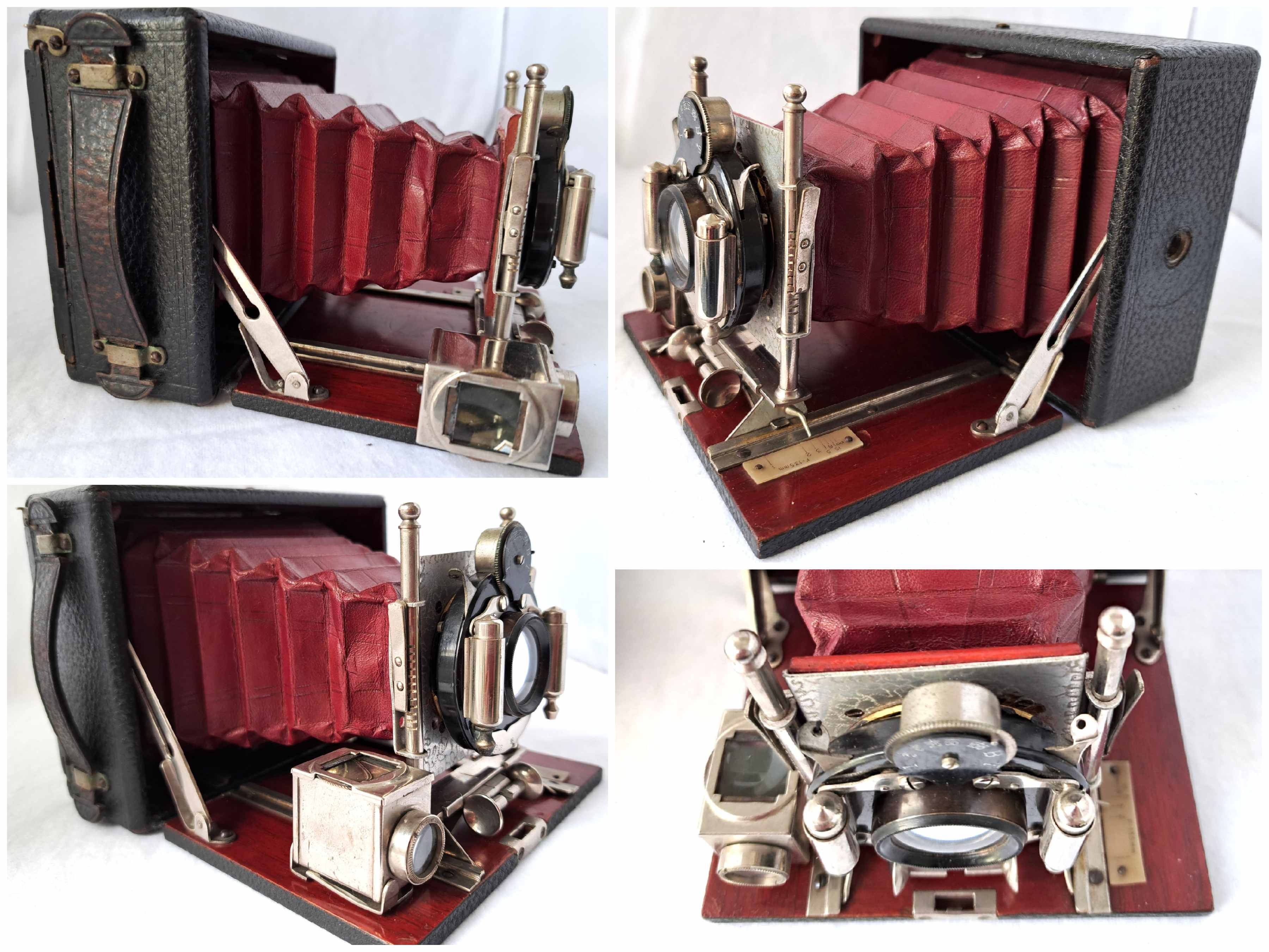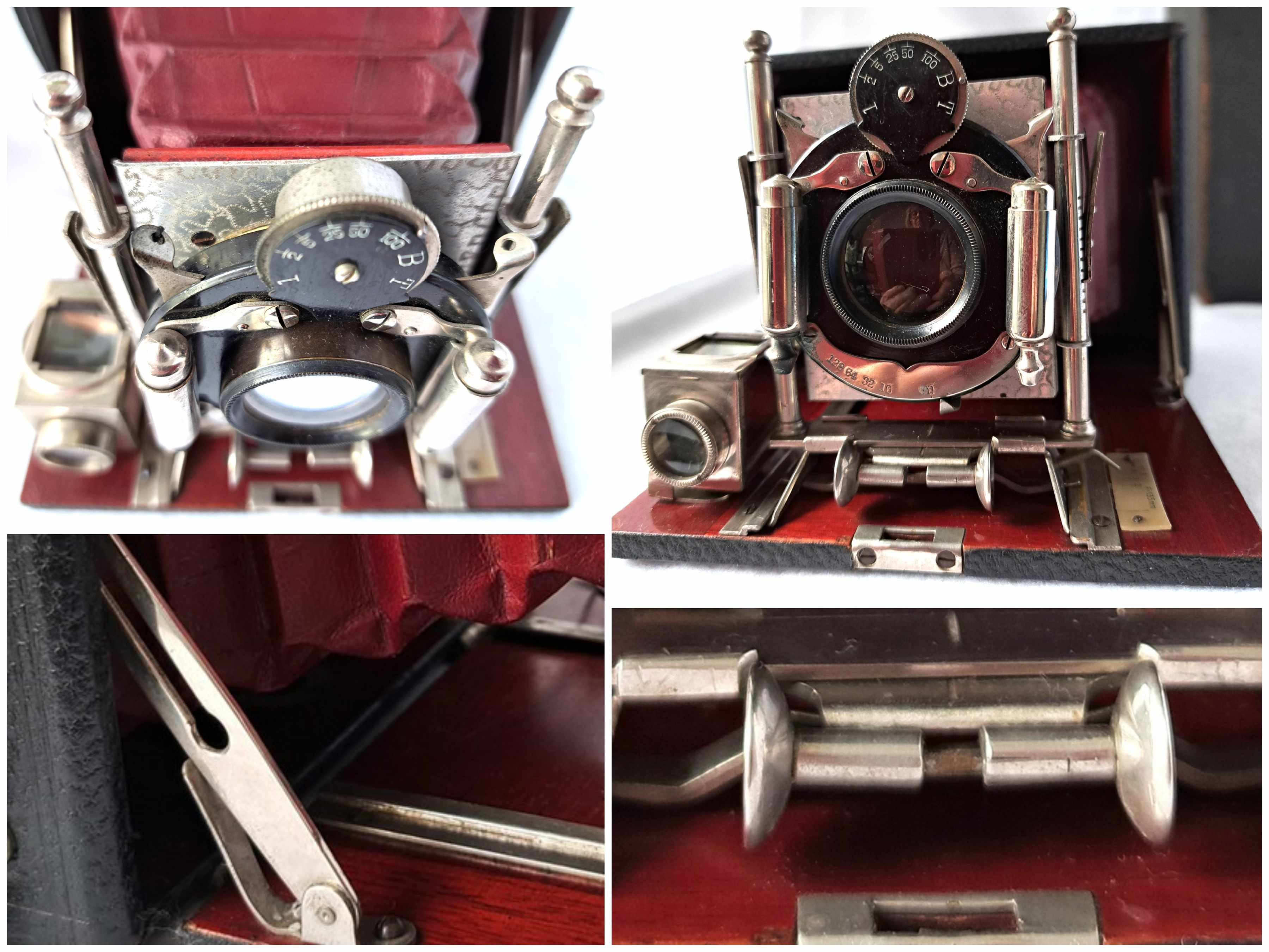 Die Kamera ist querformatig und hat ein Bildformat von 8 x 10,5 cm. Das Gehäuse und der Laufboden sind aus poliertem Mahagoni und mit feinem Leder bezogen. Im linken inneren Bereich des Holzgehäuses ist eine kleine Nummer eingestanzt: 37822 Alles ist noch sehr gut erhalten und enthält keine Schadstellen. Der rote Lederbalgen ist innen mit Stoff beklebt und dicht. Alle Metallteile sind vernickelt.