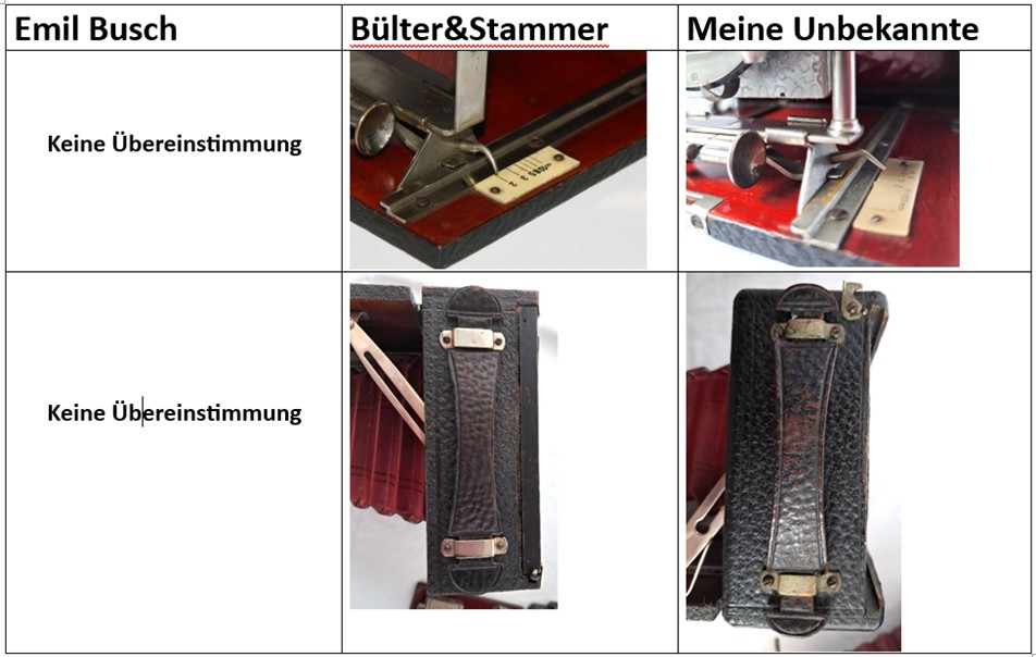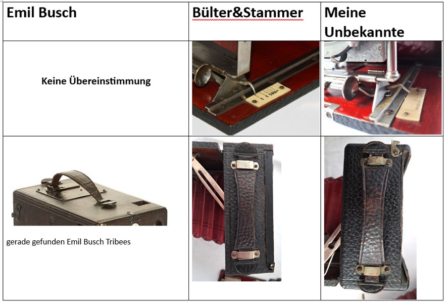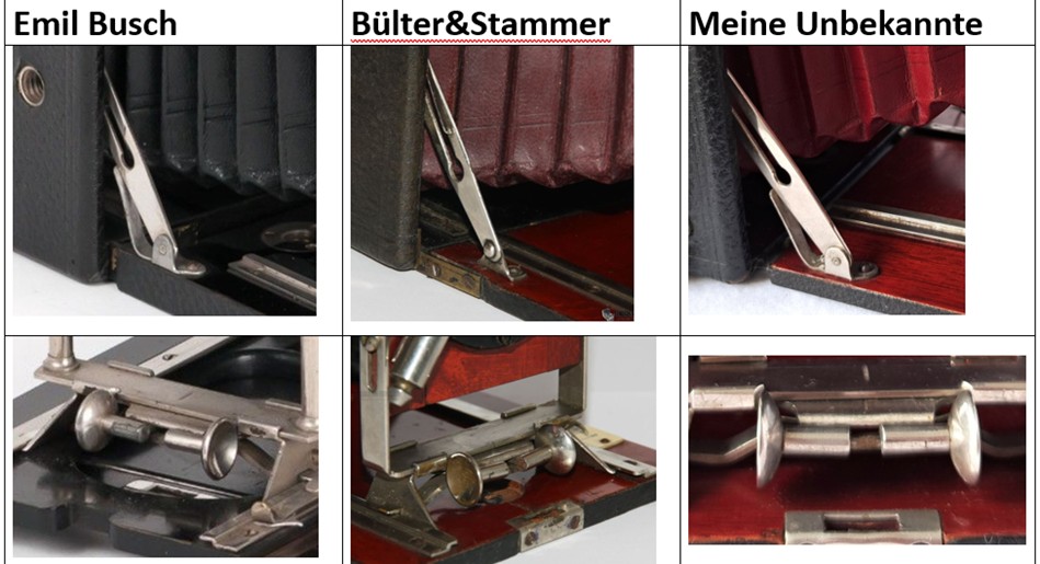 das war ja eine schnelle Antwort . Wie verhält es sich mit den Spreizen, die ja ähnlich der Busch-Kamera sind. An meiner Kamera ist nirgendwo ein Hinweis auf den Hersteller oder Vertreiber zu finden. Kann es sich hierbei auch um eine Quick Klappkamera von Bülter&Stammer handeln.