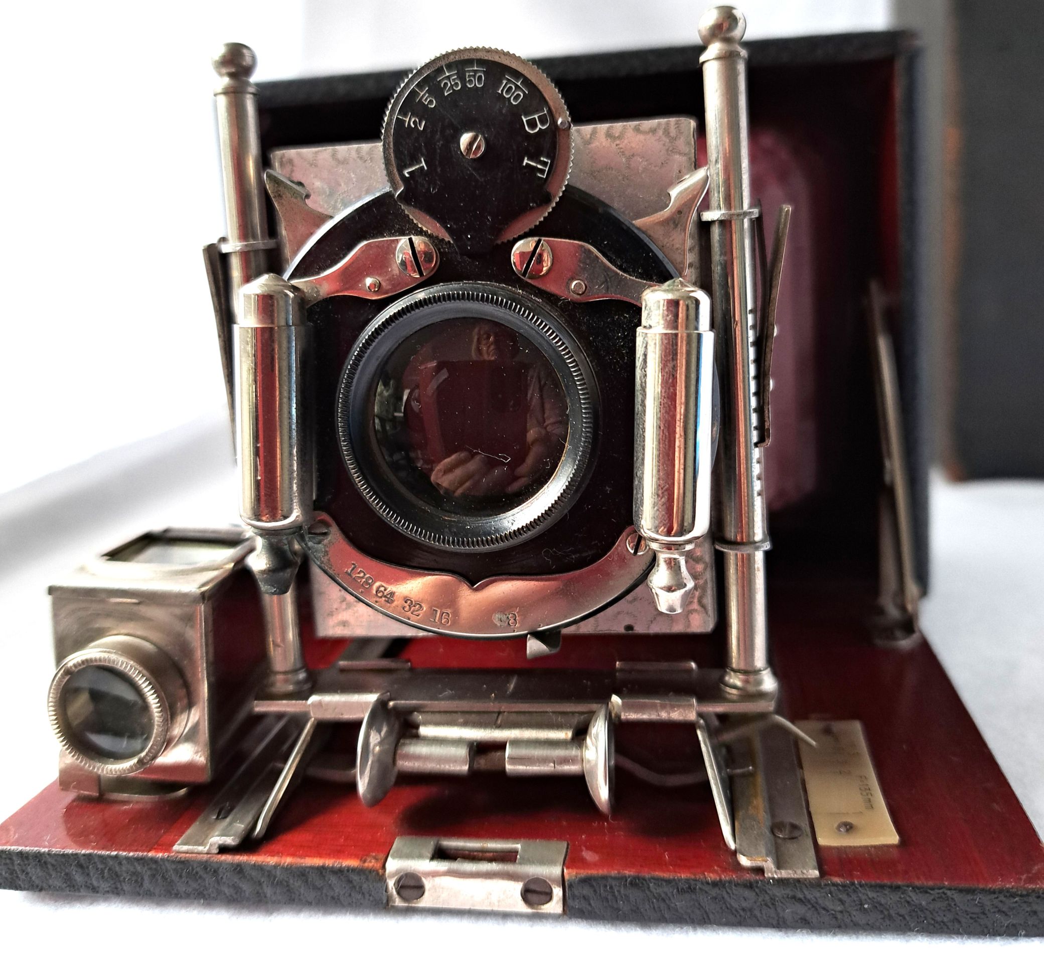 Das Objektiv ist ein Extra Rapid Aplanat mit einer Blende von 8 - 128 und einer Brennweite - gemessen - von 13 cm. Um den Verschluss muss ich mich noch kümmern. Obwohl es ein 2-Ventil Verschluss mit Luftbremse ist (kann mit Blasebalg oder Hebel ausgelöst werden), muss man vorher noch einen Hebel ( wusste ich doch, dass da wieder ein Hebelchen auftaucht ) auf der linken Seite spannen, bevor man den Verschluss auslösen kann. Auch hier keinerlei Hinweis auf den Hersteller - könnte auch von Busch sein.
