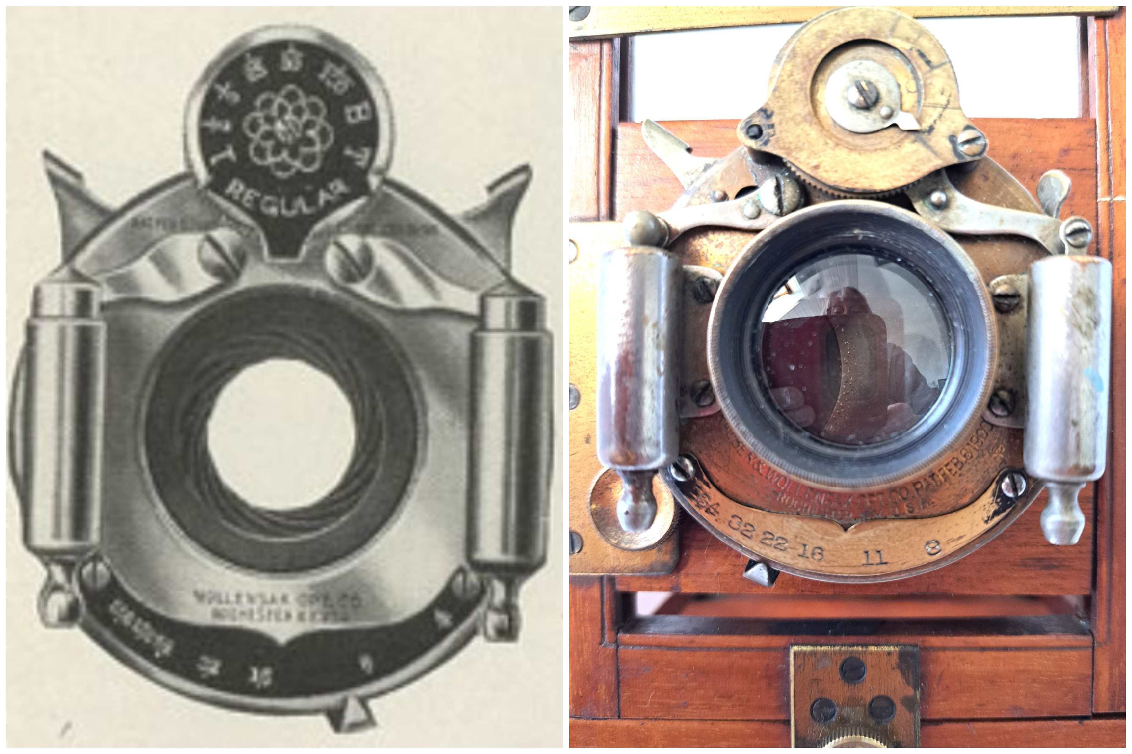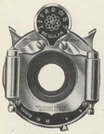 Der Verschluss heisst "Regular" und stammt von Wollensak / Rochester USA. Er wurde zwischen 1901 und 1910 gebaut. In Frankreich hiess der Verschluss "Vitesse". Er ist ein Spannverschluss (ein Spannhebel + ein Auslösehebel). Die Version mit nur einem Hebel hiess bei Wollensak (wie bei vielen anderen Verschlussherstellern) "Automat".