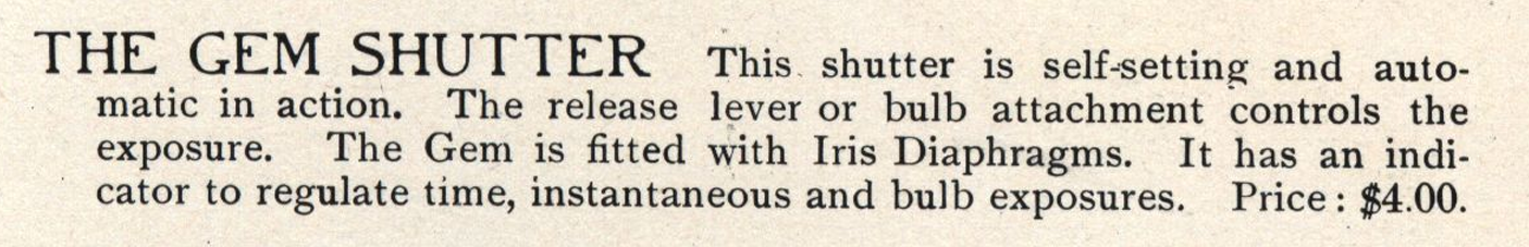 Bei den Modellen B und C im Katalog von 1903 ist vom GEM-Verschluss erwähnt, aber auch im Zusammenhang, dass Pocket Poco C eine Zahnstange und Ritzel als Fokussierungseinrichtung hat. Da ich das bei meiner Kamera nicht gefunden habe, nehme ich an, dass es sich um die einfache Pocket Poco mit Spezial Pocket Poco Verschluss handelt.