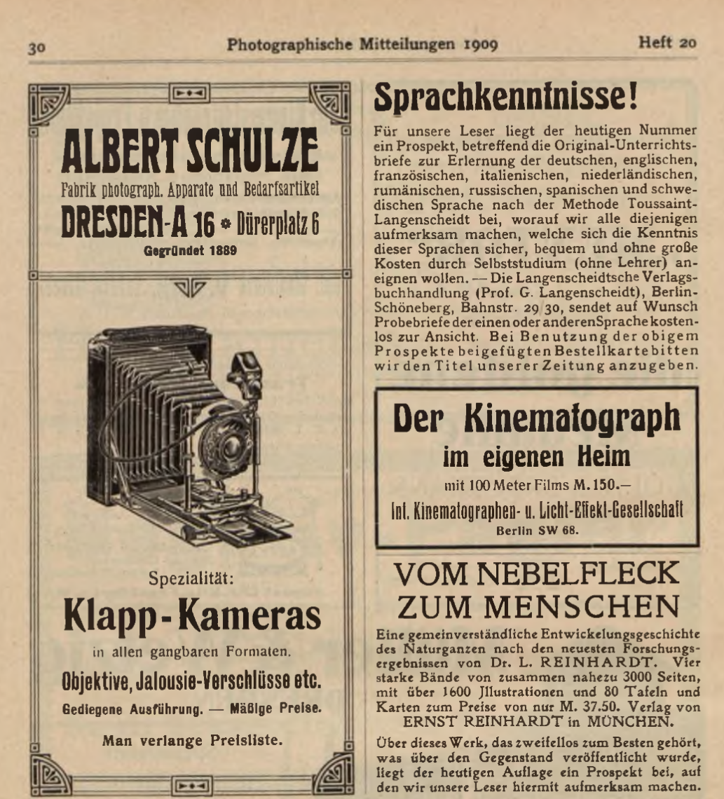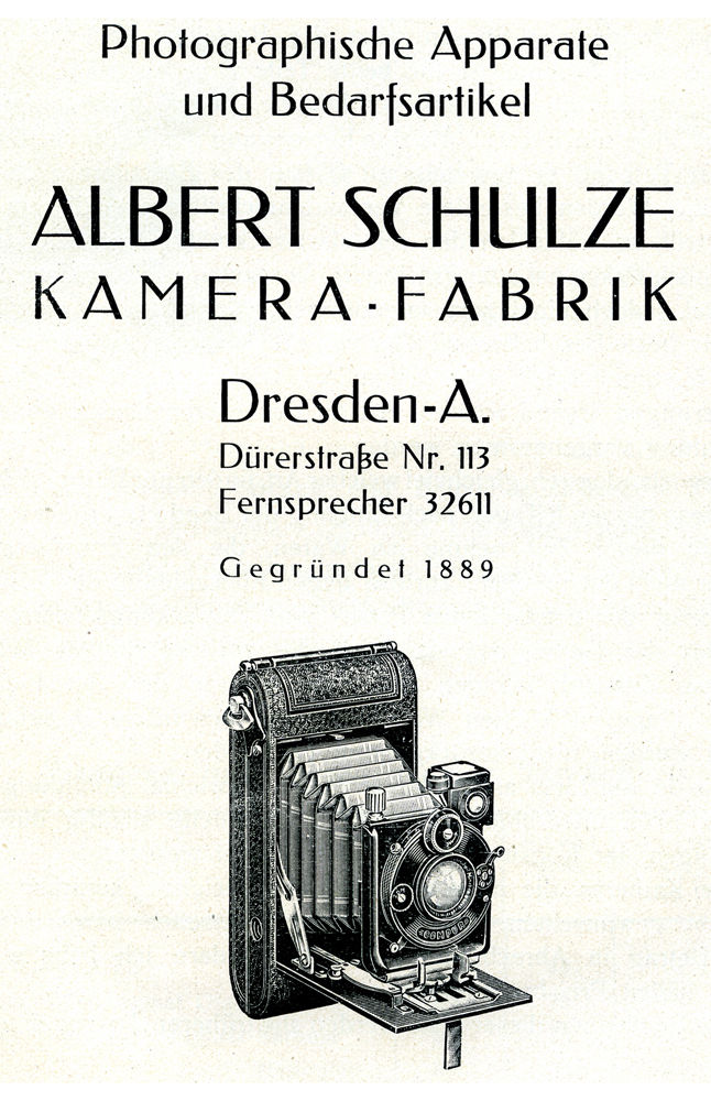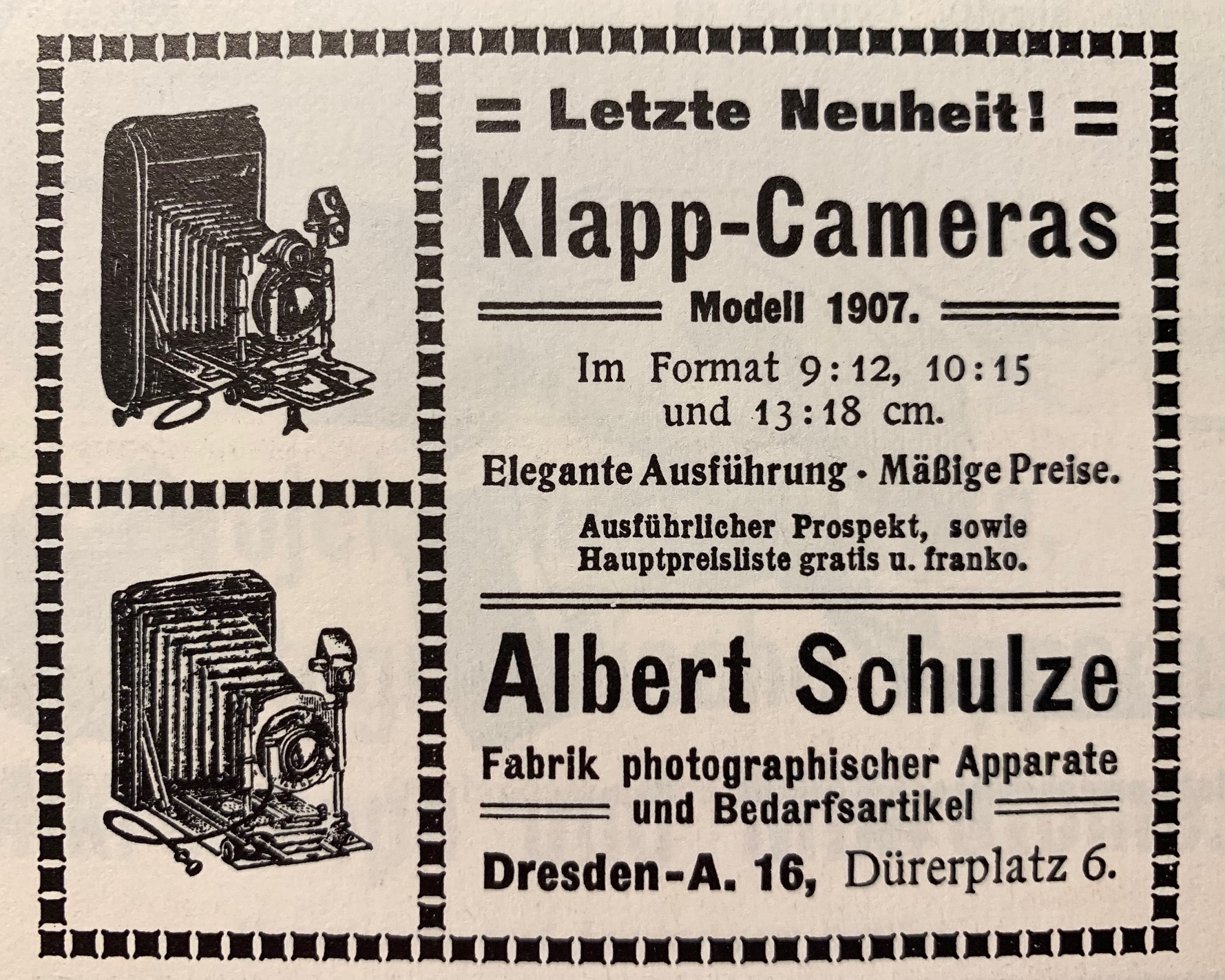 Zur Firma Albert Schulze ist die Informationsdichte insgesamt sehr mager. Ich habe eben mal nachgeschaut und nur zwei Werbeanzeigen mit Plattenkameras gefunden: