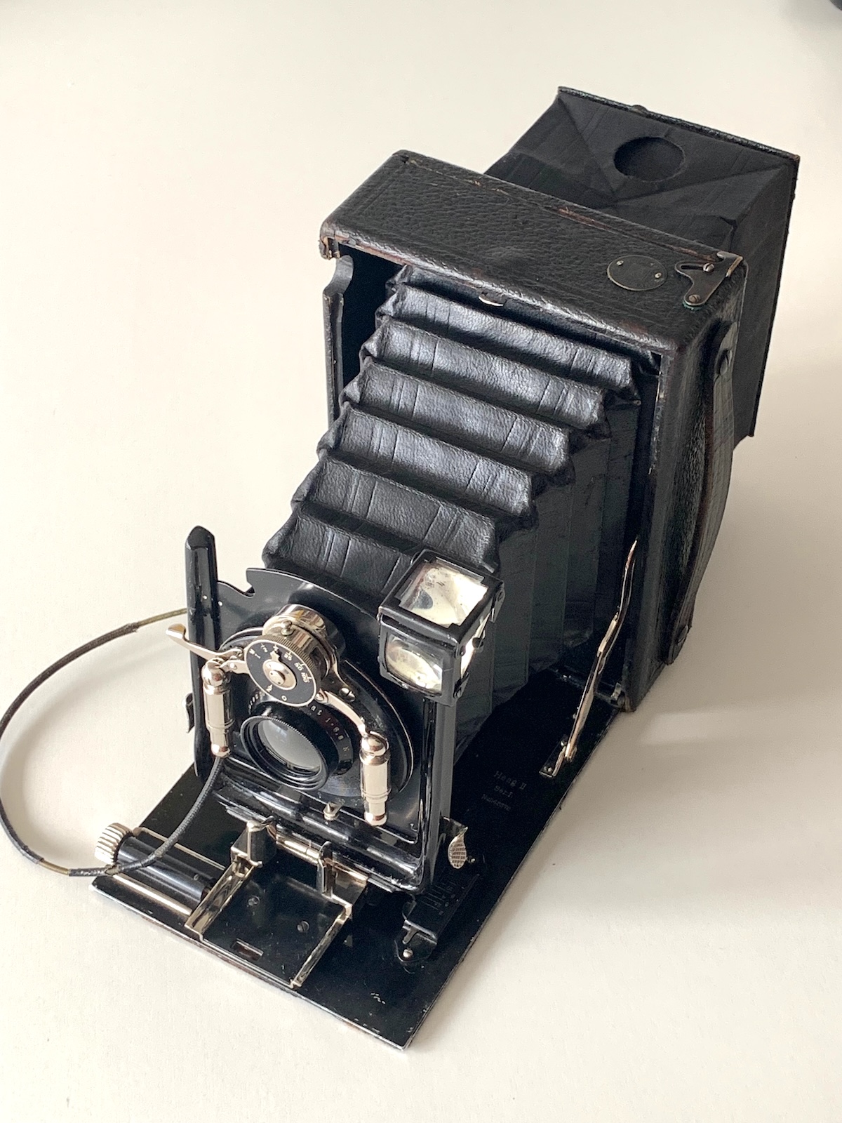 Die Belederung dieser Kamera war äußerlich stärker berieben; die Kamera ist aber wider Erwarten innen ganz sauber und – abgesehen vom verschlissenen Drahtauslöser – technisch einwandfrei, sodass ich diesen Beifang doch in die Sammlung aufgenommen habe.