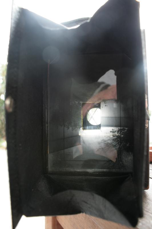 im beiliegenden Bild sieht man eine Mattscheibe mit Klarglasfleck. Das wäre nichts besonderes - aber auf der Mattscheibe einer 9x12-Plattenkamera hatte ich das noch nie gesehen. Im Bild erkennt man trotz dessen bescheidener Qualität besser als am Original, daß dieser Fleck nachträglich angebracht wurde - erkennbare Kittränder, Kreuz und Fleck gegeneinander leicht verschoben. Die Kamera war zweifllos in intensivem Gebrauch, technisch o.k., äußerlich stark abgenutzt. Ungewöhnlich deutliche Spuren vom Gebrauch am Stativ, viele Breitformataufnahmen, überwiegend aber Hochformatnutzung (nur hinteres Stativgewinde genutzt). Das Dominar 1:4.5/135 in einem Klio (1/100 - 1s, T,B) zeugt davon, daß der Besitzer ein preisbewußter Nutzer gewesen sein dürfte, der mehr Wert auf die optische Leistung gelegt hat als auf das Prestige - Compur und Tessar waren deutlich teurer, ohne wesentlich mehr zu bieten. Sieht alles so aus, als ob der Eigner viel Wert auf schnellere Schußbereitschaft gelegt hat. Ein selbstspannender Verschluss ist ja auch etwas schneller im Gebrauch beim Nachteil einer größeren Verwacklungsgefahr. Es ist ein Stück aus der Übergangszeit - Lederprägung ICA Trona 210, auf Laufboden und Rückwand Zeiss Ikon. Vielleicht gab's das ja auch quasi zu Abverkaufspreisen ...