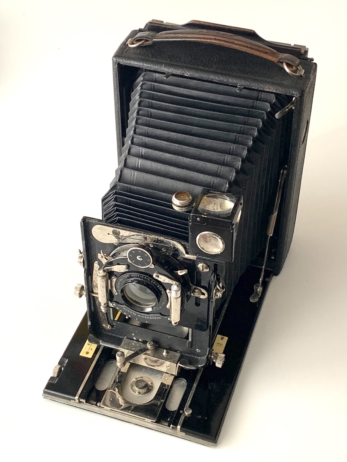 bei einem schwedischen Online-Auktionshaus wurde ein Konvolut aus drei nicht näher beschriebenen Plattenkameras angeboten, von denen sich eine als Hüttig Ideal 13x18 identifizieren ließ. Für den Konvolutpreis von 28 € schien mir das Risiko gering; umso größer meine Zufriedenheit, als die Kamera zwar Korrosion an den Metallteilen aufweist, ansonsten aber völlig in Ordnung ist – die Mechanik läuft nach einer ersten Reinigung geschmeidig, der Balgen wirkt beinahe neuwertig, auch der Verschluss tut, was er soll.