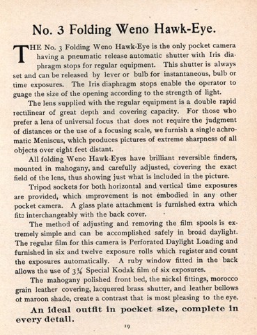 Ich habe mich sehr eng an die Beschreibungen in den Katalogen gehalten, es können höchstens Fehler bei der Übersetzung passiert sein. Deshalb versuche ich meistens, die Original-Katalogseiten in den Beschreibungen einzubinden. Bei dieser Kamera habe ich es leider versäumt und der Zusammenfassung des Aufsatzes über die Kamera den Vorzug gegeben, weil er mir sehr gut gefallen hat. Hier die originale Katalogseite.