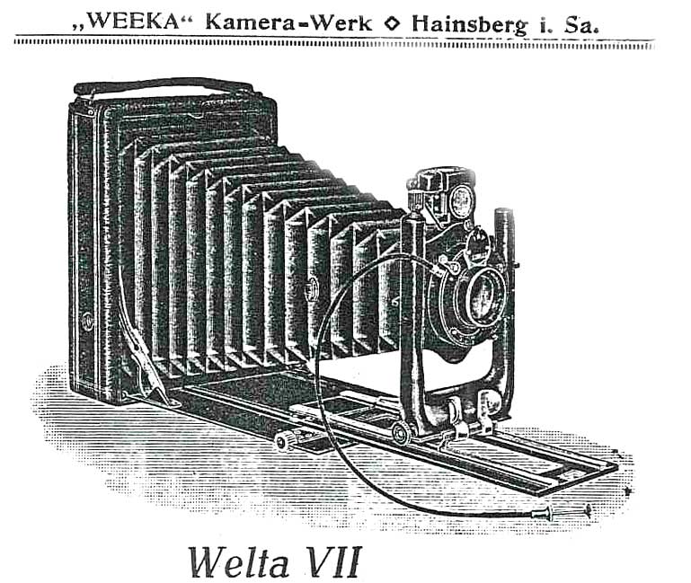 Es handelt sich um das Modell „Welta VII“ im Aufnahmeformat 9x12. Die folgende Abbildung aus einem Weeka-Katalog (vmtl. von 1914) zeigt dagegen das Modell Welta VII im Aufnahmeformat 10x15.