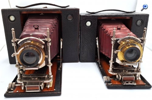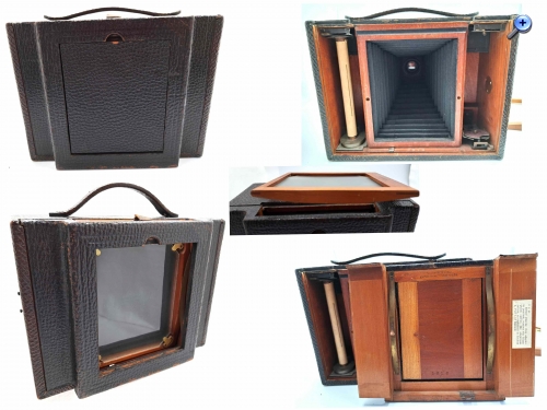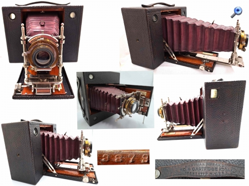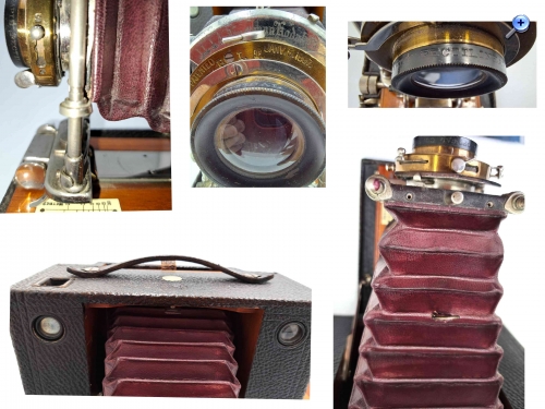 Technische Merkmale Format 5x4 Zoll (Rollfilm oder Glasplatten, je nach Einsatz) Objektiv Frontlinsenfassung mit Gewinde, mit Rapid Rectilinear Verschluss Eastman Triple Action Shutter Ventil unterhalb des Objektivs Blende Hebelsteuerung 4 – 128 US, 8 – 128 (etwas versetzt) Standarte Metallstandarte, Höhen- und Seitenverstellung Balgen rotes Leder, doppelter Auszug Laufboden Mahagoni in Lederbezogener Metallwanne, vernickelte Laufschiene Seriennummer 3879 deutet auf ein sehr frühes Modell um 1900