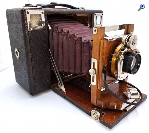 Hüttig Lloyd Kamera mit Holzstandarte vor 1900 - ein frühes Hybridmodell für Film und Platte