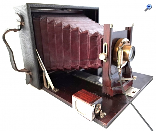 • Gehäuse: Mahagoni mit Lederbezug • Außenmaße: 16 x 20,5 x 8,5 cm • Standarte: Holzstandarte fingerverzapft, mit vernickelten Metallteilen, höhenverstellbar durch Lösen einer Rändelschraube • Balgen: Roter Lederbalgen mit doppeltem Auszug • Laufboden: klappbar aus Mahagoni mit Metallschienen