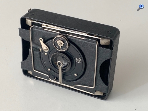 Die Modellbezeichnung deutet es an: Es handelt sich um eine sehr kleine, mit nur 155 g auch sehr leichte Plattenkamera für das Westentaschenformat 4,5x6. Das Gehäuse besteht aus Aluminium mit Hammerschlaglackierung, die hellen Teile sind vernickelt. Trotz der leichten Konstruktion steht das Objektivbrett sehr fest. Das mag auch daran liegen, dass dieses Exemplar kaum gebraucht wurde und kaum Abnutzung aufweist.