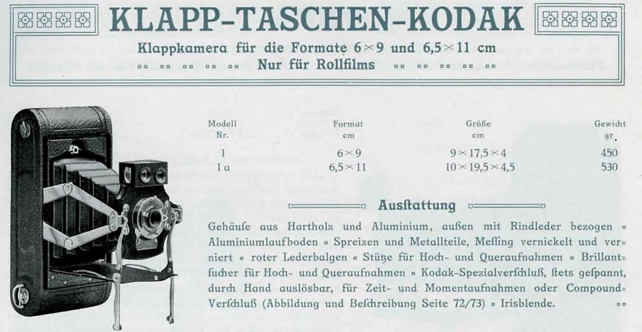 im Katalog von Rüdenberg 1909 wird eine Klapp-Taschen-Kodak No. 1 angeboten. Mir fällt der Doppelbrillantsucher auf. Der Fotograf brauchte also beim Wechsel von Hochformat zu Querfortmat, wenn er den Brillantwinkelsucher nutzen wollte, nicht mehr den Sucher umschwenken. Kleine Komfortsteigerung ...