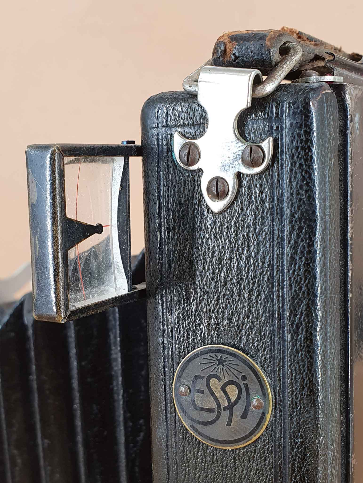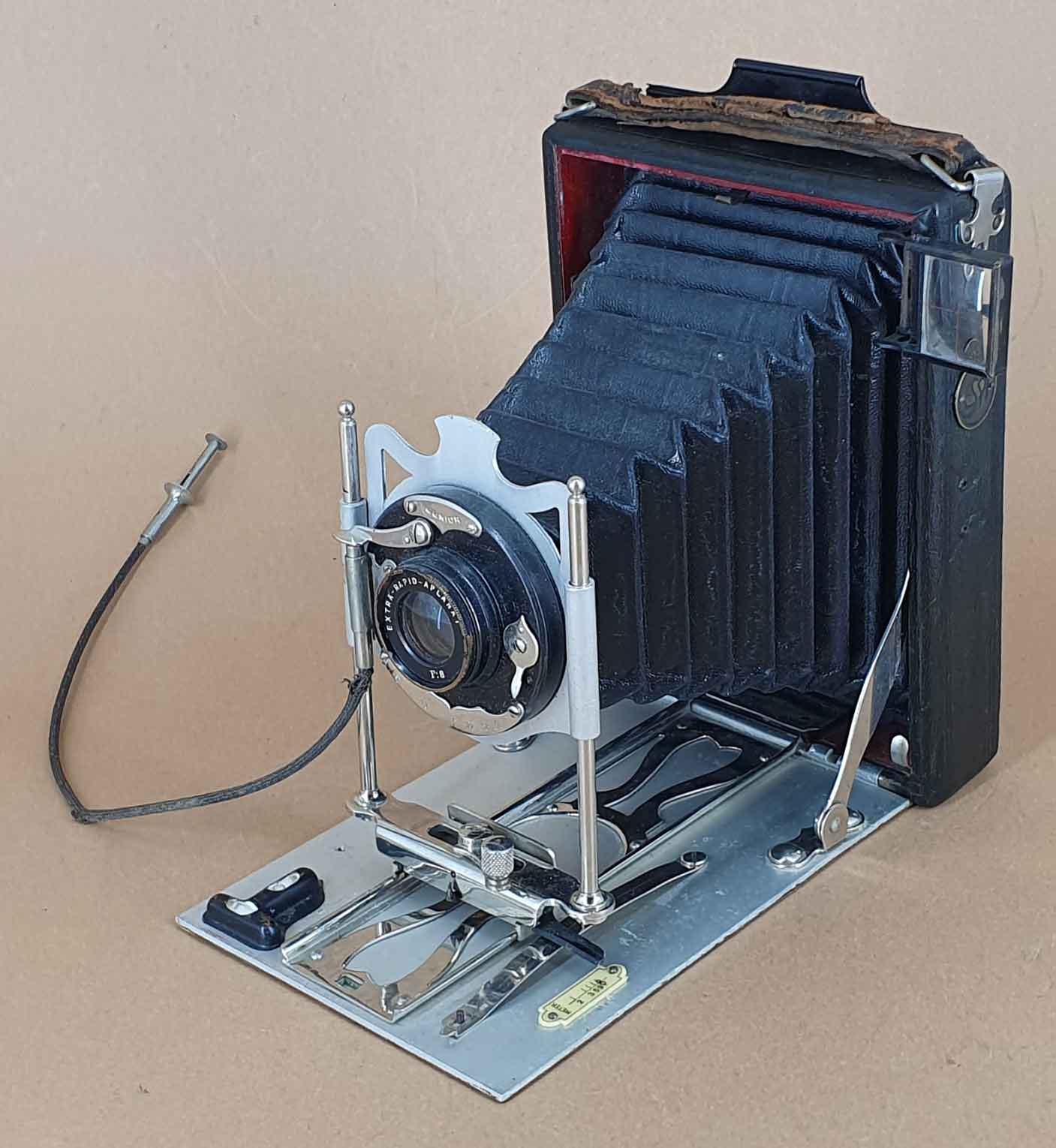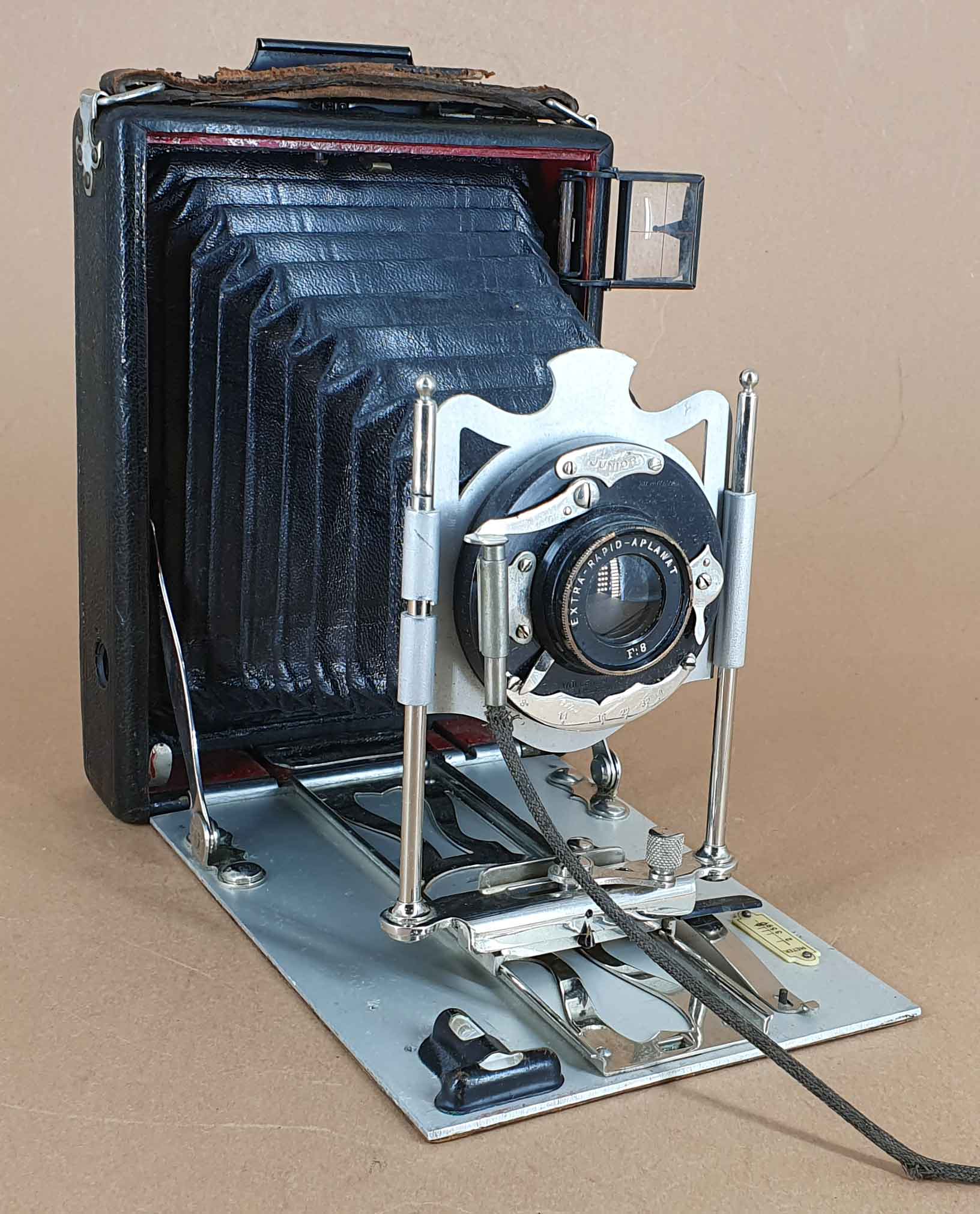 Spezifikationen: Platten-Klappkamera im Aufnahmeformat 9x12, Holzgehäuse und Leichtmetalllaufboden mit schwarzem Lederbezug, einfacher Auszug ohne Trieb, Objektivträger horizontal und vertikal verschiebbar (für vertikale Verschiebung fehlt die Feststellschraube), klappbarer Newtonsucher, zwei Stativgewinde, Tragegriff, Extra-Rapid-Aplanat F:8 im Wollensak-Junior-Verschluss, Mattscheibenrückteil fehlt, Libelle auf dem Laufboden (wahrscheinlich nachträglich)
