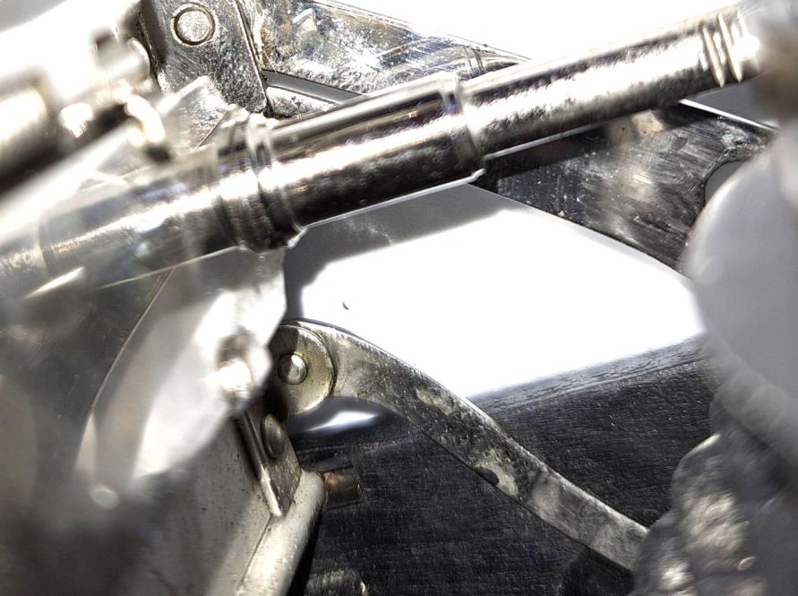 Hinter der eigentlichen Spreize befindet sich eine zweite mit Schraubengelenke am Gehäuse und auf dem Laufboden.