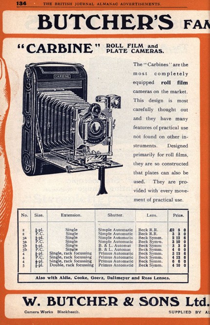 Einstieg in Fotografie: Ab ca. 1897 begannen die Söhne W.E. & F.E. Butcher mit der Herstellung fotografischer Geräte.