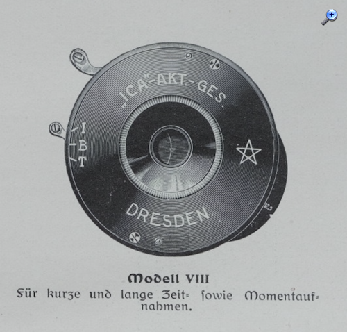 Ich möchte hier Jan zitieren: "Bei dem Verschluss dürfte es sich um den Lloyd-Verschluss Nr. VIII handeln, der 1909 in das Ica-Programm übernommen wurde; unten eine Abbildung der späteren Ica-Version. In der einfachsten Ausstattung hatten solche Kameras eine achromatische Linse, wie es in den Katalogen hieß – in der Tat eine sehr einfache Bestückung, wie sie manche Boxkameras hatten."