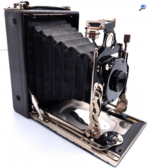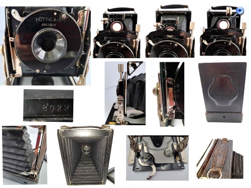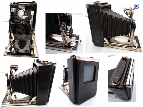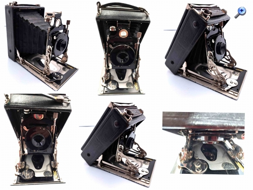 vielen Dank für deine Informationen. Jetzt kann ich Objektiv und Verschluss benennen. Was hat es mit der Vernietung des inneren Balgens mit dem Außenbalgen auf sich. Man sieht die Vernietung auch von außen. Kann es sein, dass sich die Verklebung gelöst hat und nachträglich mit Nieten nachgeholfen wurde? Ich werde morgen die Kamera vorstellen und die Besonderheiten der Mechanik zum Aufrichten der Standarte und zum Ausfahren des Balgens beschreiben.