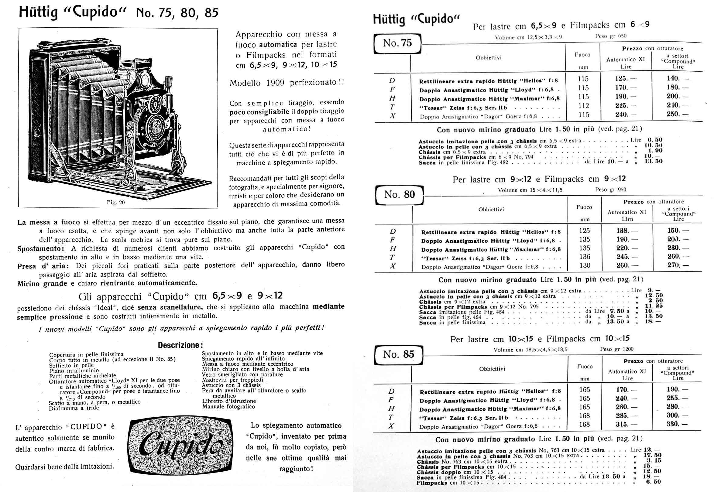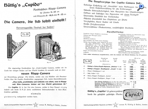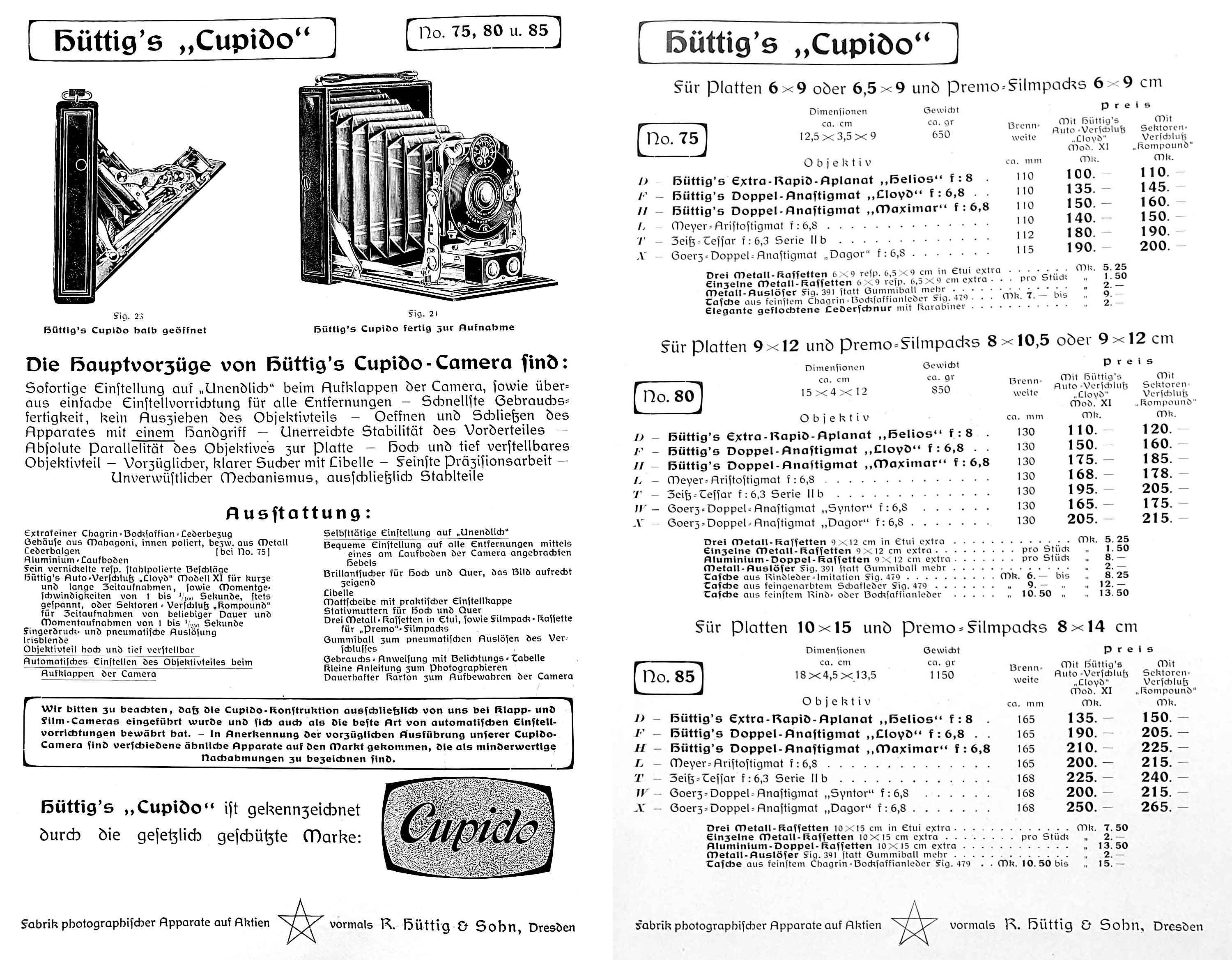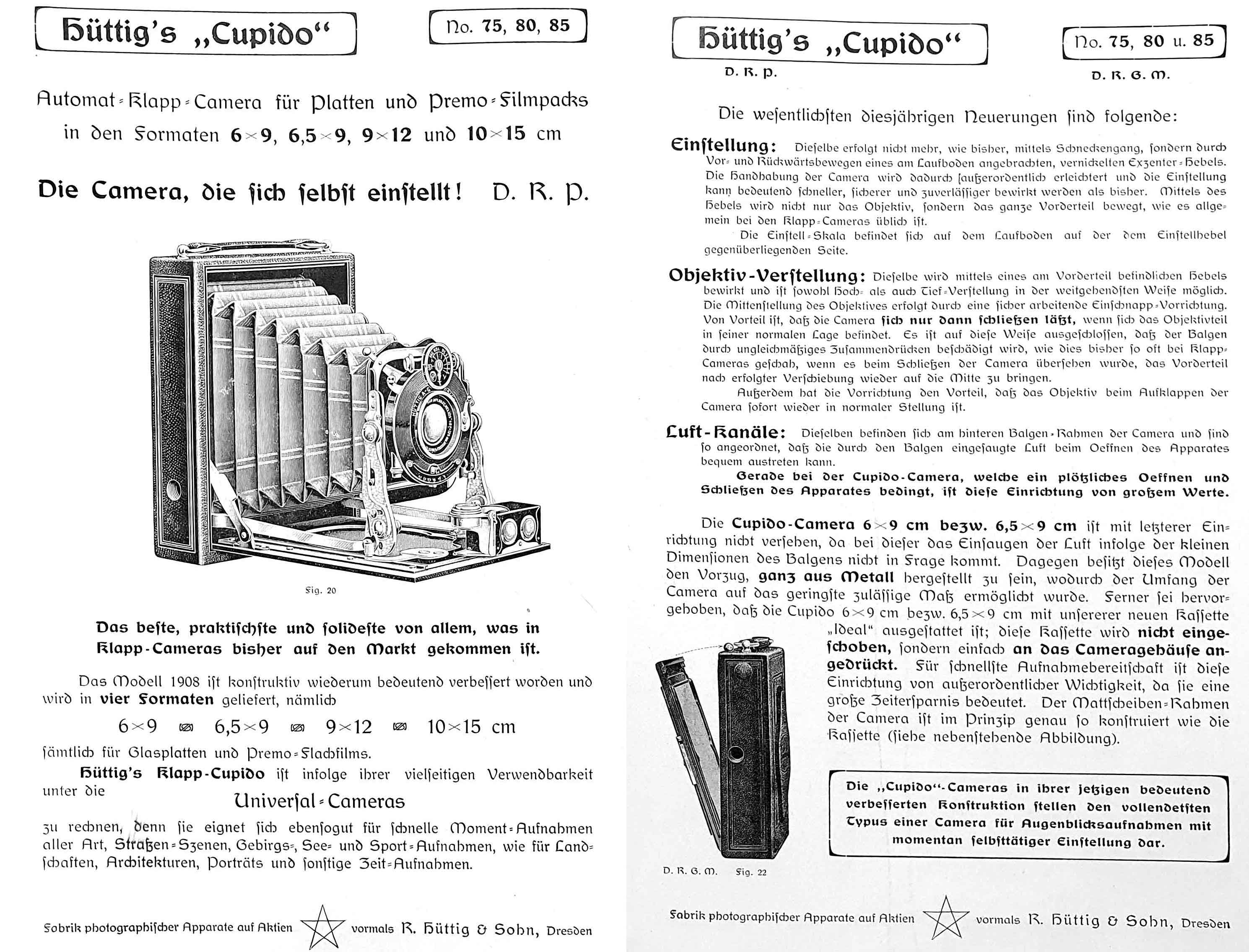 Zitat aus Photo Antiquaria PA 7 von 1976 Seite 6 ff Geschichte der Photoindustrie Deutschland von James E. Cornwell Folge 5 „Nach einigen „mageren“ Geschäftsjahren kam 1906 ein neuer Aufschwung durch das Erscheinen einer Schlitzverschlusskamera Modell „Helios“ und einer Zweiverschlusskamera „Hekla“. Ein Jahr später schuf die Firma R. Hüttig einen weiteren Höhepunkt im Kamerabau mit ihrer Erfindung der „Springkamera“, „Cupido“ genannt (DRP Nr. 179 377 vom 27.01.1906). Tatsächlich genügte ein Fingerdruck auf den federnden Knopf am Kameragehäuse, um das Vorderteil mit richtigem Abstand in die senkrechte Stellung zu bringen. Leider konnte man nur Platten verwenden; damit wurde der mit dem Springmechanismus erzielte Fortschritt und Beschleunigungsfaktor durch das zeitraubende Platteneinlegen wieder zunichte gemacht.“