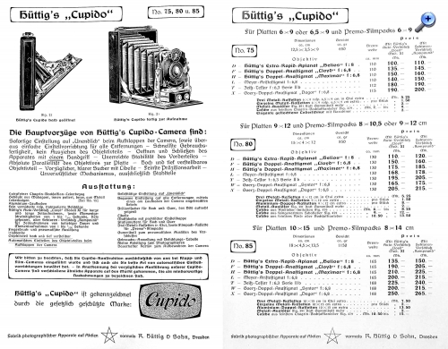 als kleine Ergänzung: Auch bei Hüttig besaß die Kamera im Format 9x12 die Nr. 80 (zumindest 1908 und 1909). Bei der Einführung 1906 besaß sie noch die Nummer 111 und es gab sie zunächst auch nur im Format 9x12. Die einfache Ausstattung von Ingrids Kamera lässt sich aber im Katalog nicht für die Cupido nachweisen (die Hüttig Atom ist mit einfachem Achromat im Angebot).