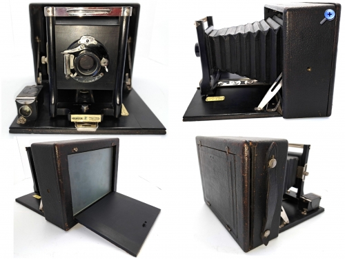 es soll die Plattenkamera Nr. 2 der Seneca Camera Manufacturing Company vorgestellt werden, gefertigt ab 1902. Die Modelle haben sich nicht verändert, nur das Ebenholzfinish und der schwarze Lederbalgen werden im Katalog von 1909 erwähnt. Das hat diese Kamera mit der im Forum schon vorgestellten Black Beauty von Seneca gemeinsam. Insgesamt ist sie einfacher ausgestattet.