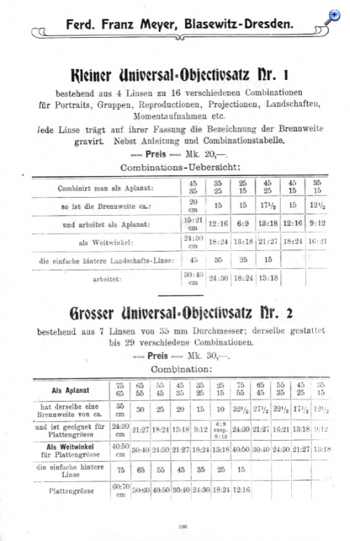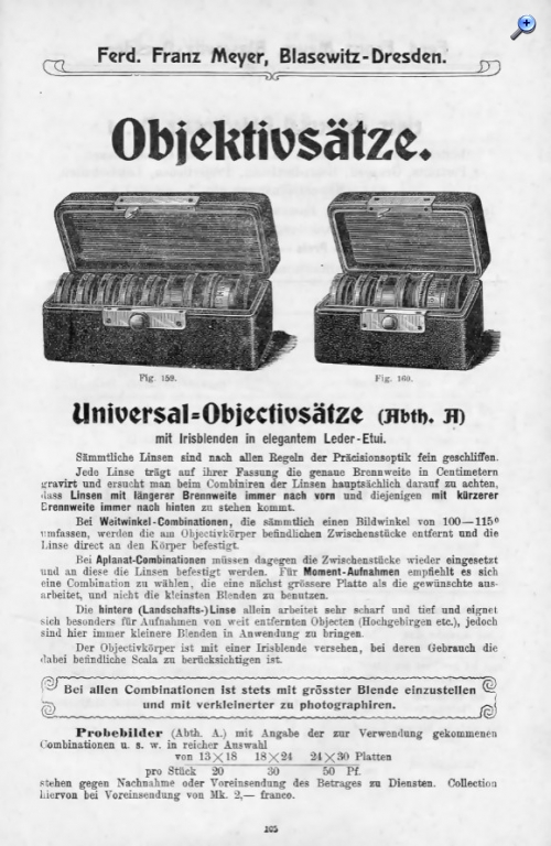 Hier zwei Seiten aus dem Meyer-Katalog von 1910, der im Übrigen noch weitere dieser Objektiv-Sätze aufzeigt.