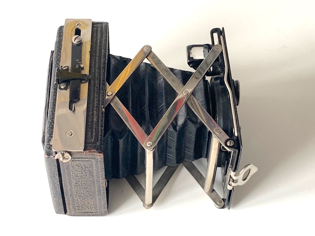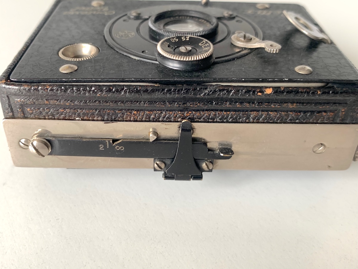 Es handelt sich um eine Scherenspreizenkamera für Platten 4,5x6 im Metallgehäuse; die Entfernungseinstellung erfolgt über die Spreizen; ein federnder Hebel auf der Oberseite bewirkt eine Arretierung in der Position ∞. Wird die Arretierung aufgehoben, ist Naheinstellung möglich, allerdings nur sinnvoll über die Mattscheibe möglich, denn außer der Marke 2 m gibt es keine Einstellskala.
