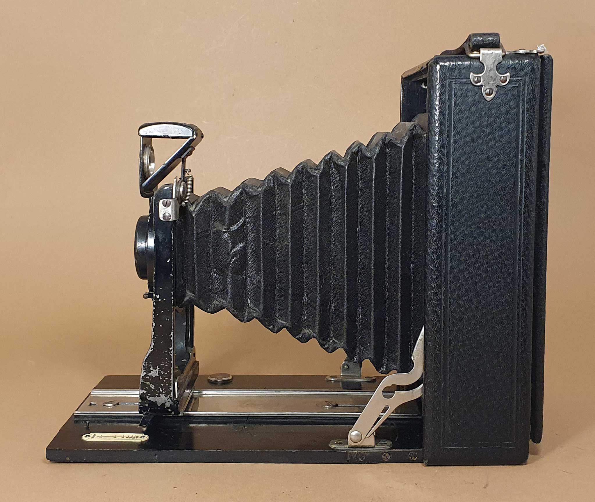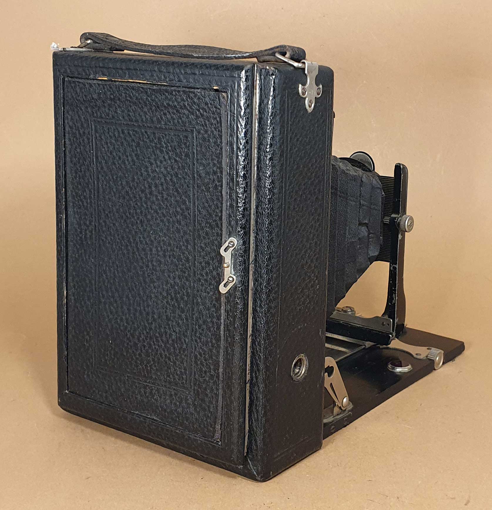 Die Kamera für das Aufnahmeformat 10x15 besitzt ein Holzgehäuse, einen Laufboden aus Holz und ist mit schwarzem Kunstleder bezogen. Sie verfügt über einen einfachen Auszug und wird über Triebschraube fokussiert. Der Objektivträger ist vertikal mittels Triebschraube verschiebbar. Eine horizontale Verstellung ist durch einfaches Verschieben der gegossenen U-Standarte möglich. Weitere Ausstattungsmerkmale sind: ein neigbarer offener Brillantsucher, eine Libelle im Laufboden und zwei Stativgewinde. Die ursprünglich vorhandene Arretierung der Standarte in der Unendlich-Stellung fehlt beim vorliegenden Exemplar.