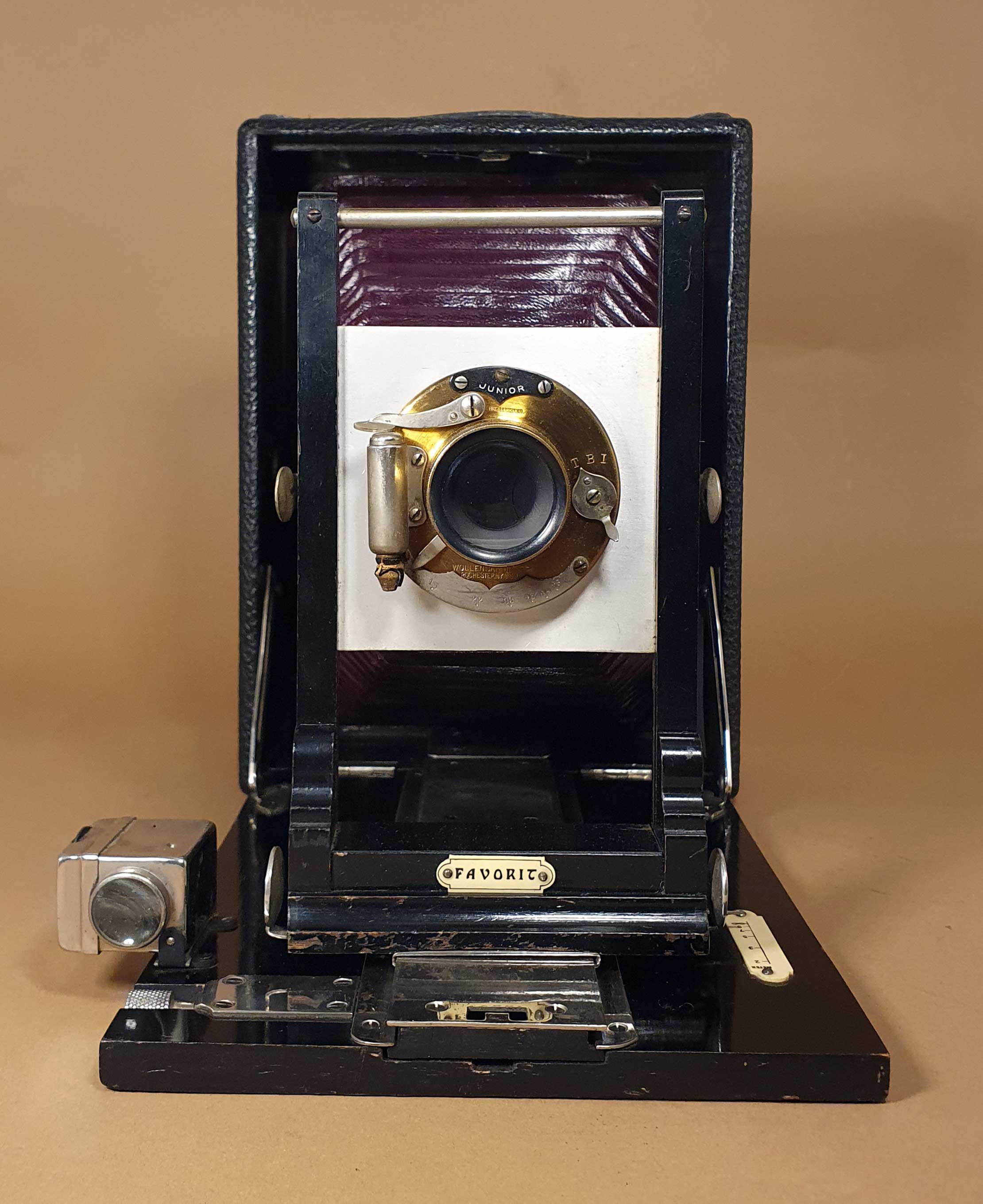 Bestückt ist das vorliegende Exemplar mit einem nicht näher bezeichneten Extra-Rapid-Aplanat unbekannter Brennweite F: 12 in einem Wollensak Junior-Verschluss.