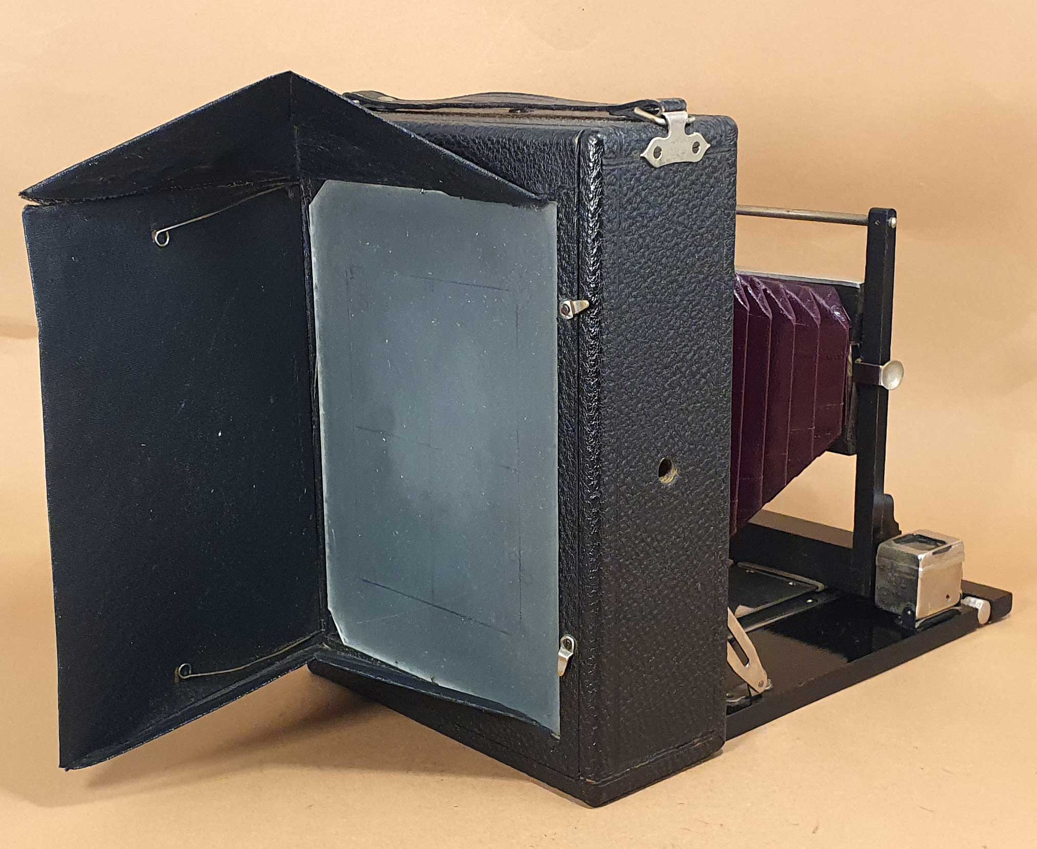 Das Holzgehäuse und der hölzerne Laufboden der Plattenkamera für das Aufnahmeformat 13x18 sind schwarz beledert. Die Kamera verfügt über einen gebrauchsmustergeschützten doppelten Auszug mit einfachem verdecktem Trieb. Der Objektivträger in der hölzernen Standarte ist nur vertikal verstellbar. Als Sucher dient ein geschlossener schwenkbarer Brillantsucher auf dem Laufboden. Für Stativaufnahmen im Hoch- und Querformat sind zwei Gewindeanschlüsse vorhanden.