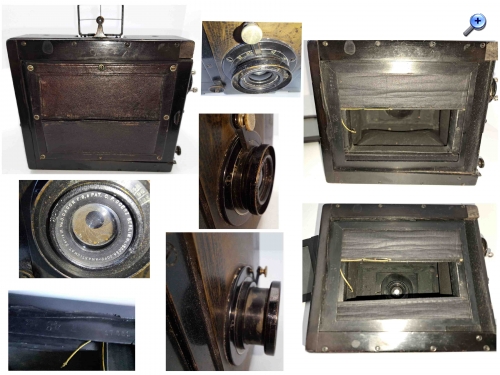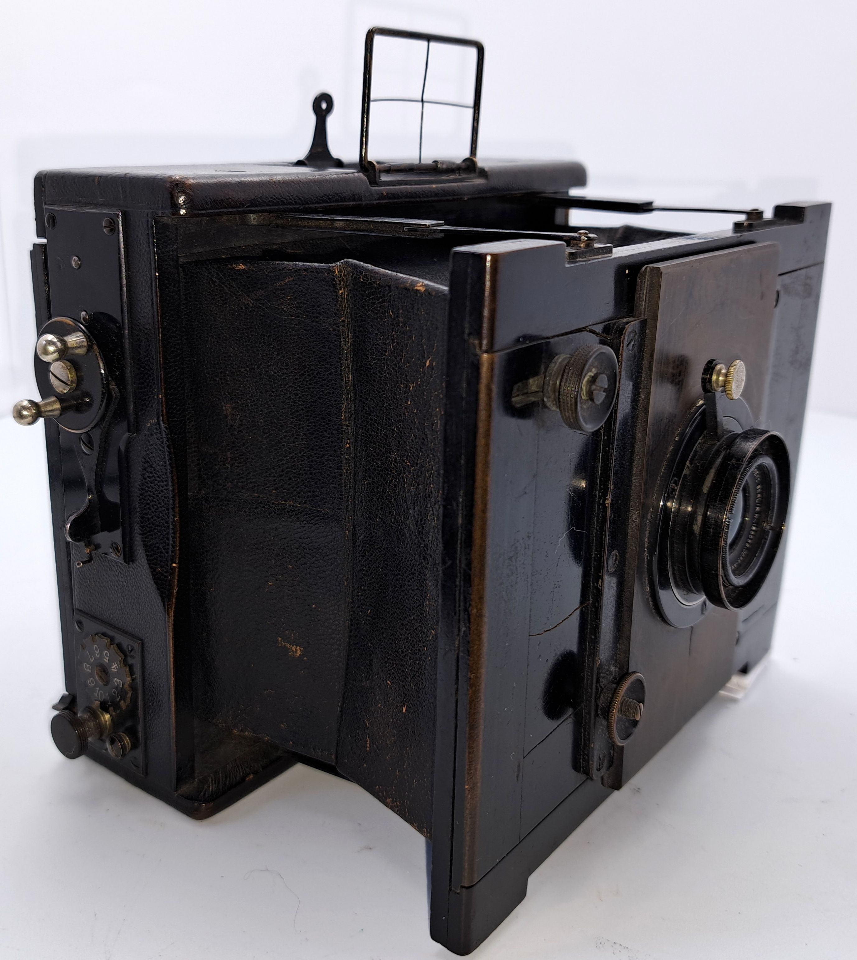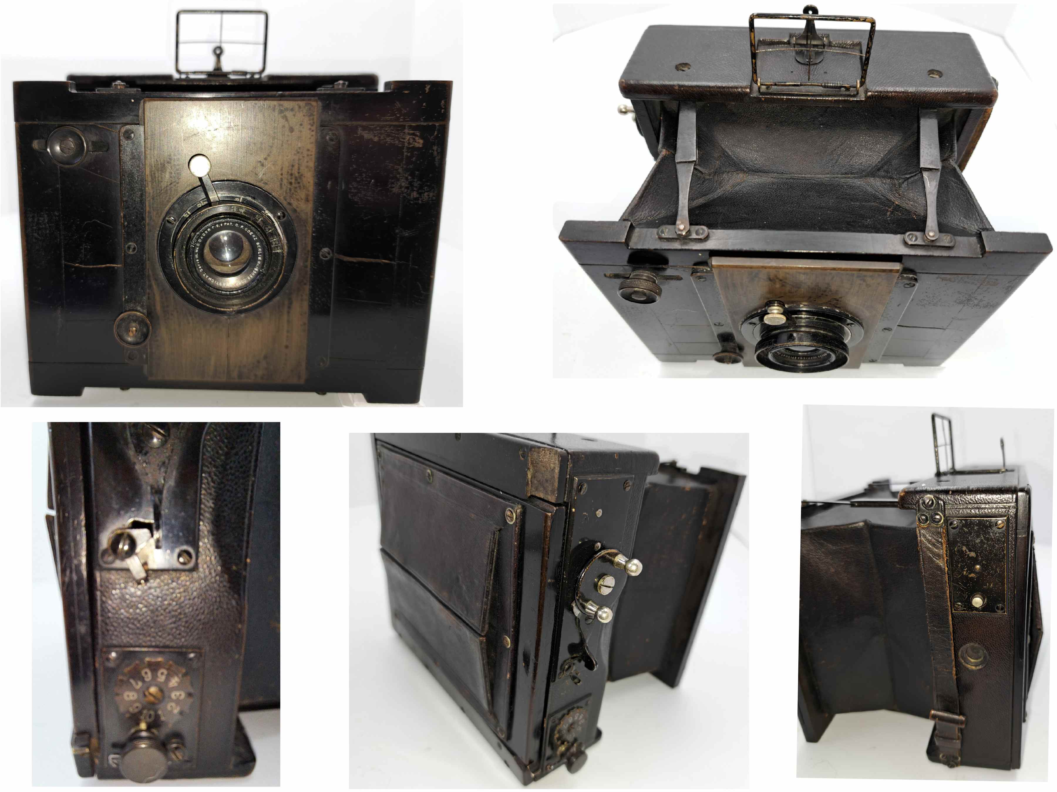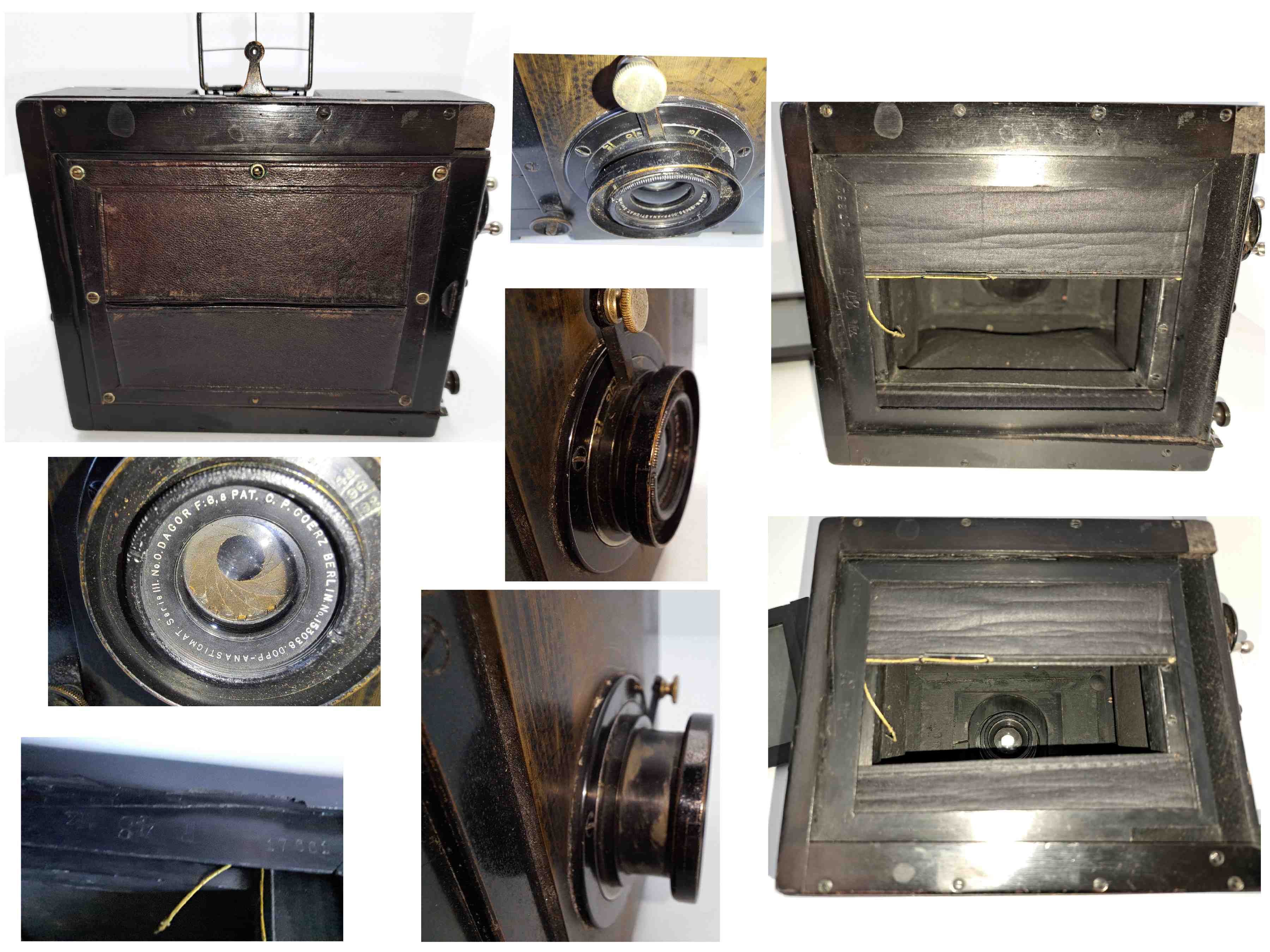 Meine Kamera im Format 9x12 hat einen lederbezogener Holzkorpus. Der Lederbalgen ist nicht gefaltet und wird mittels zweier Spreizenpaare gespannt. Die Seriennummer der Kamera ist 17661. Eine weitere Prägung E 48 Mz befindert sich neben der Seriennummer und im Inneren des Lichtschachts.
