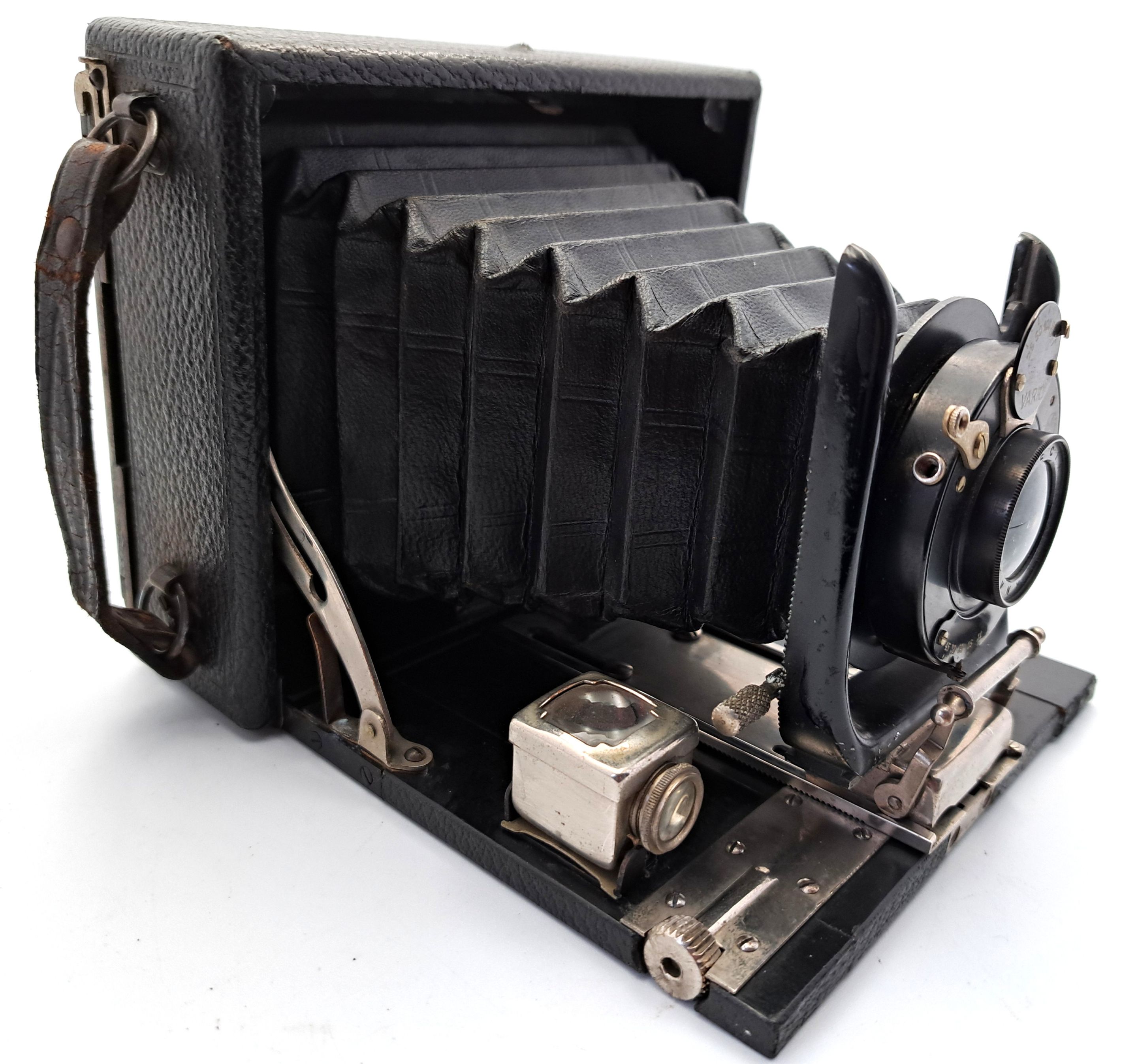 Ungereimtheiten : Gehäuse und Laufboden aus Holz, keine Vorrichtung zur seitlichen Verstellung des Obektivträgers - erst ab 1920 – deutet auf eine frühe Plattenkamera hin Der Varioverschluss erschien erst später