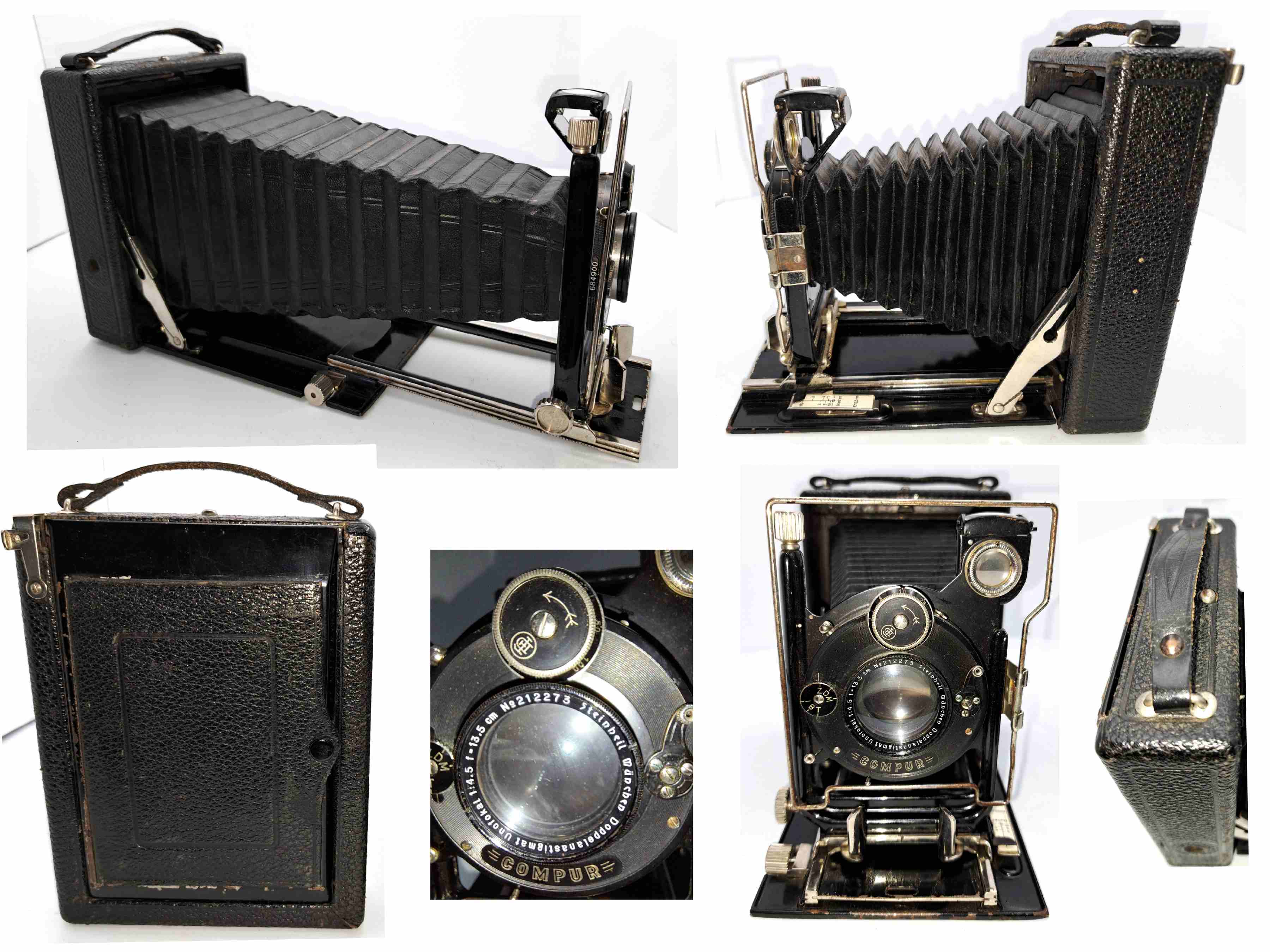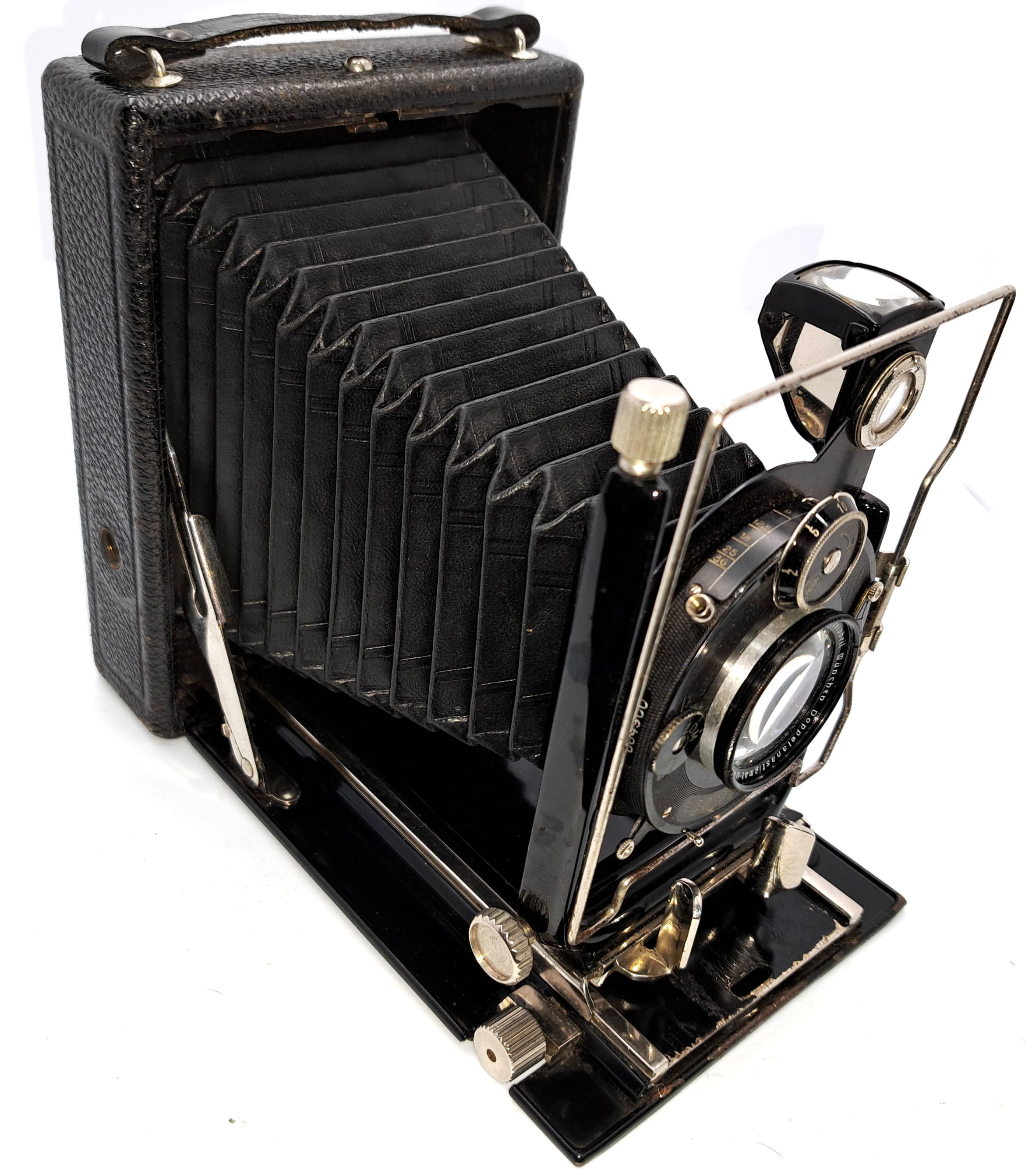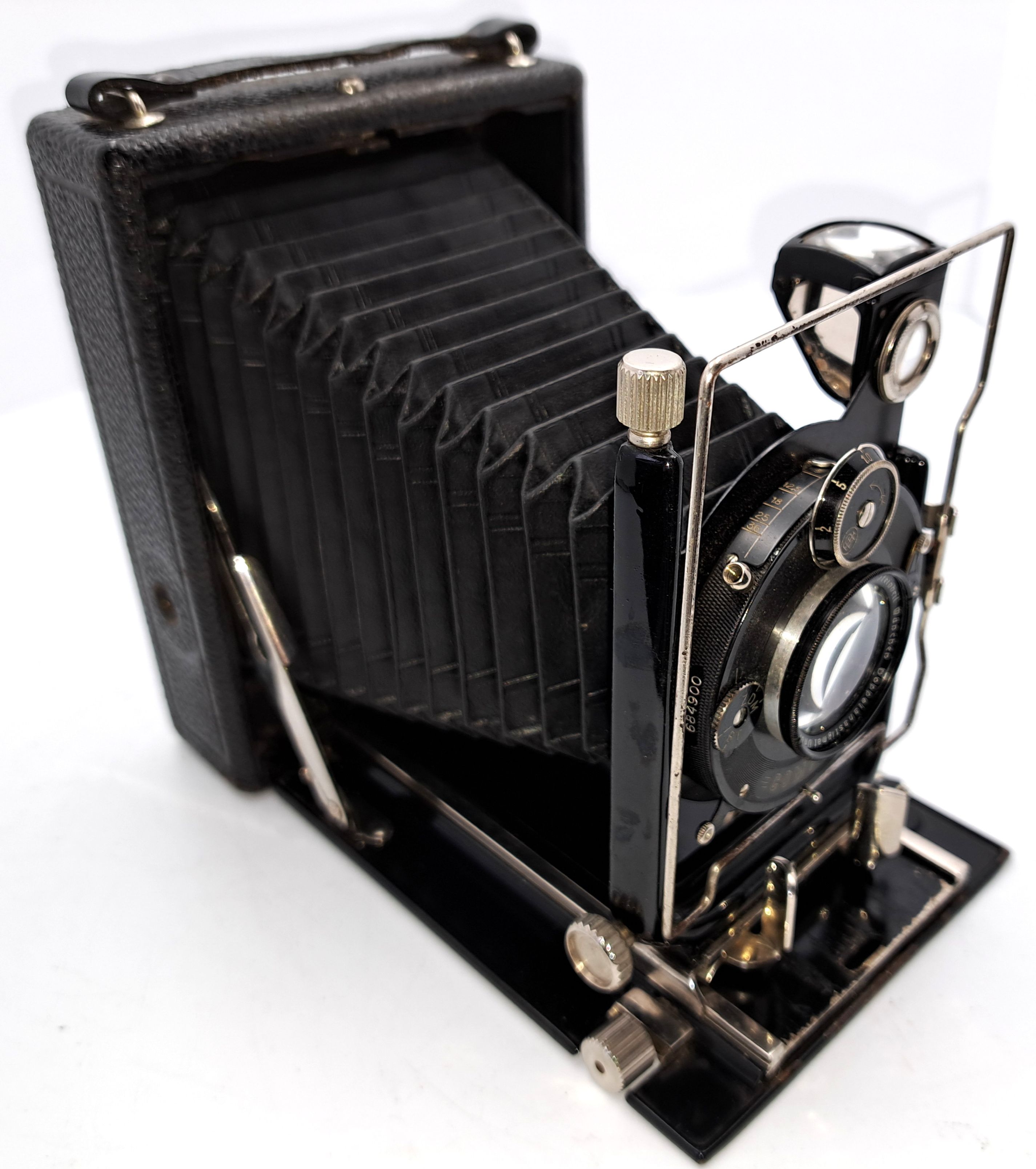 meine Kamera besitzt keine Plakette von Birnbaum. Ich kann nicht genau feststellen, ob es sich um Metallguss oder Sperrholz handelt. Auf alle Fälle ist sie vorn und hinten von einem Metallrahmen eingefasst. Bei Merkel Photo Antiquaria PA 154 Seite 14 Abb. 72 wird die Tak 9x12 aus Metall/Leder beschrieben. Die Übereinstimmung zu meiner schon vorgestellten Kamera von Birnbaum ist verblüffend - Spreizen, Handhaben, Lichtschachtabdeckung. Bei der Griffbefestigung hatte ich erst Zweifel. Dann habe ich herausgefunden, dass es sich bei dieser um die 5. Variante von Merkel Photo Antiquaria PA 153 Seite 5 handelt.