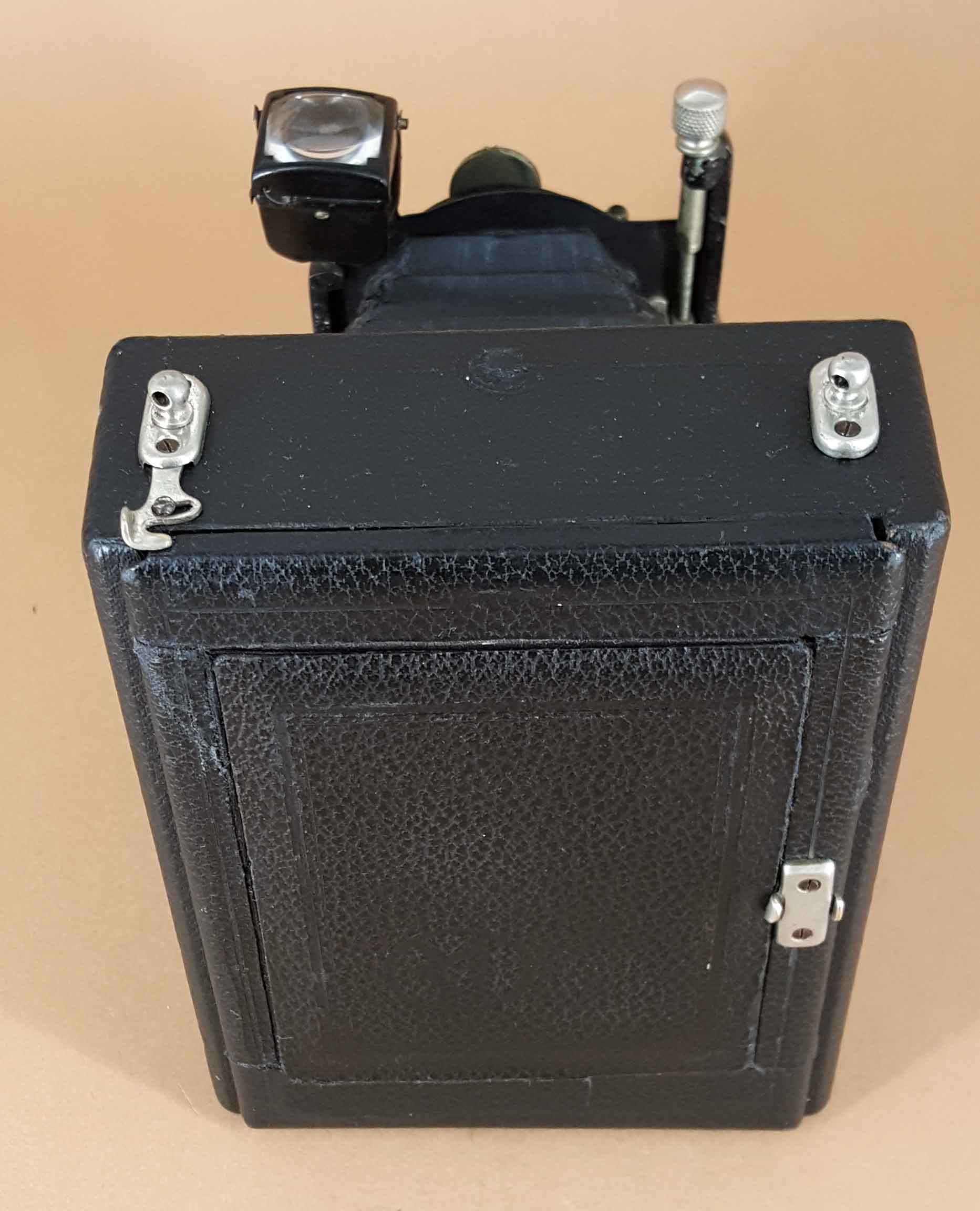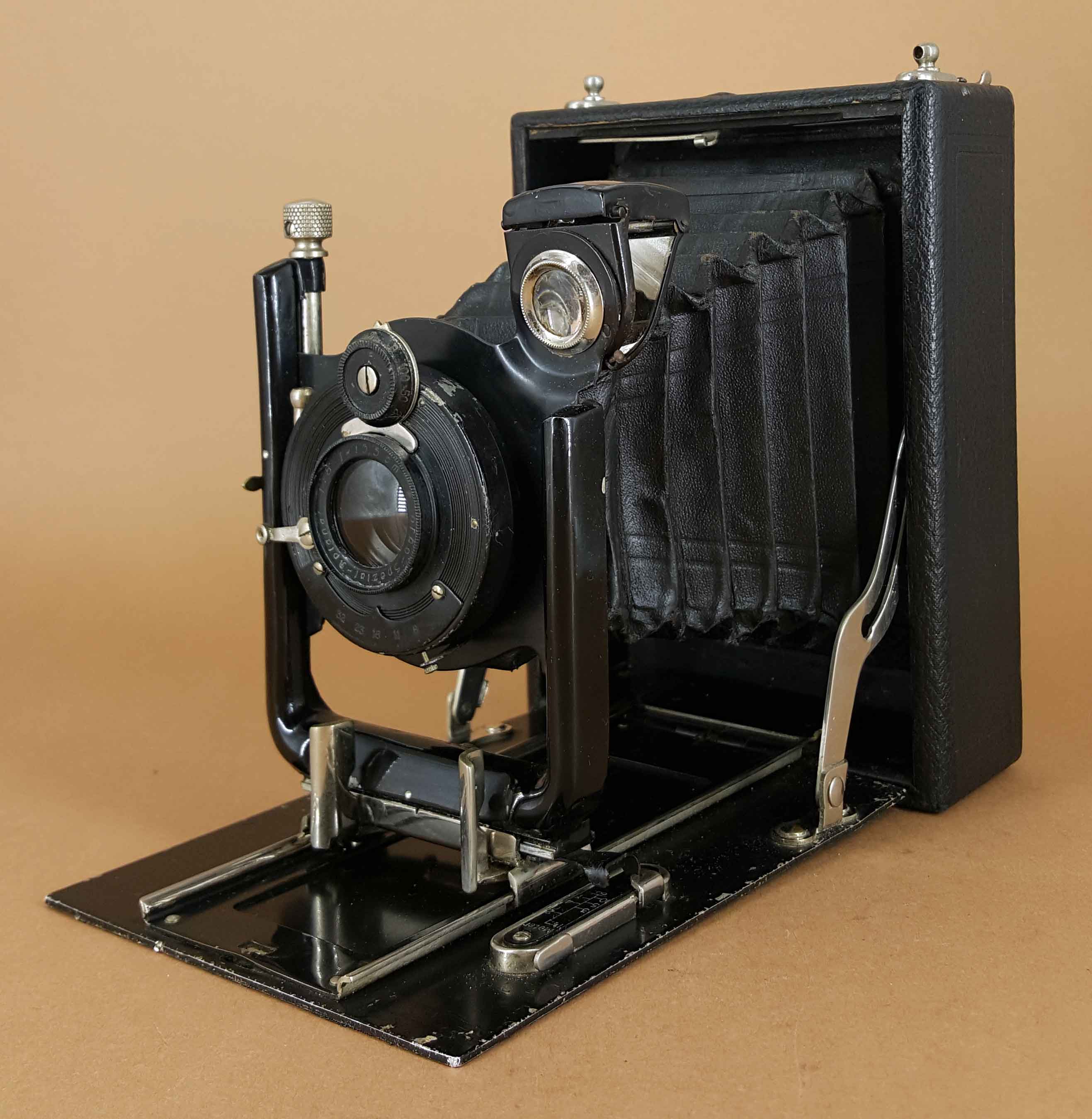 Von den verschiedenen von Erko (Erka) hergestellten Kameramodellen sind leider keine Modellnamen überliefert. Man kann ganz grob vier verschiedene Plattenkamera-Modelle unterscheiden: eine Zweiverschlusskamera (https://blende-und-zeit.sirutor-und-comp...&thread=379), eine Kamera mit doppeltem Auszug, eine Kamera mit Radialhebel-Fokussierung und die hier gezeigte Kamera ohne jeglichen Laufbodentrieb.