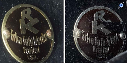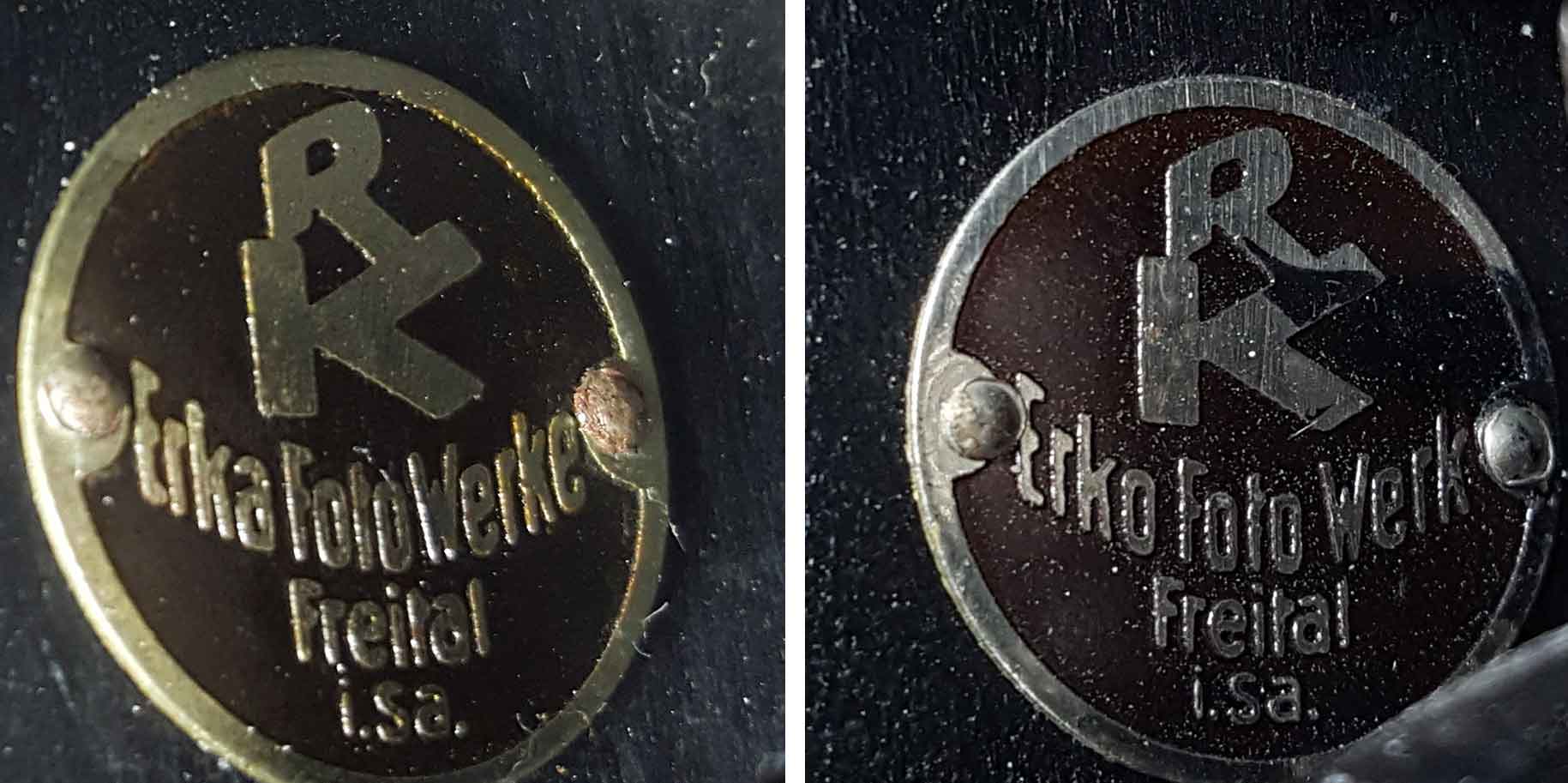 Bevor ich die Kamera selbst vorstelle, möchte ich die derzeit bekannten Informationen zur Firma Erko mal zusammenfassen. Die Firma wurde am 1. Januar 1923 unter der Bezeichnung „Erka-Photo-Werke Freital, Spezialfabrik für Kameras und Optik“ zur Eintragung ins Handelsregister angemeldet. Die eigentliche Eintragung erfolgte dann aber unter der Bezeichnung „Erko-Photo-Werk Radewenki & Koszuszek“ (wahrscheinlich im März 1923). Der Name „Erka“ war vermutlich bereits anderweit geschützt. Den Namenzusatz „Spezialfabrik für Kameras und Optik“ durfte die Firma nach Prüfung durch das Amtsgericht Freital ebenfalls nutzen. Inhaber der Firma waren Waldemar Kurt Radewensky aus Hainsberg (1914 Mitgründer von Weeka) und Karl Georg Arno Koszuszek aus Freital. Die ursprüngliche Bezeichnung „Erka“ leitete sich von den Anfangsbuchstaben der Nachnamen der Inhaber ab: Radewensky = R = gesprochen „Er“ und Koszuszek = K = gesprochen „ka“. Bereits vor der handelsgerichtlichen Eintragung stellte das Unternehmen Kameras unter der Bezeichnung „Erka“ her, wahrscheinlich auch schon vor 1923. Am 3. März 1924 musste die Firma Konkurs anmelden. Einer der zwei Firmenstandorte in Freital wurde unter der neuen Firma „Erkos“ weitergeführt. Hier zum Vergleich die Plakette der Erka und die Plakette einer Erko: