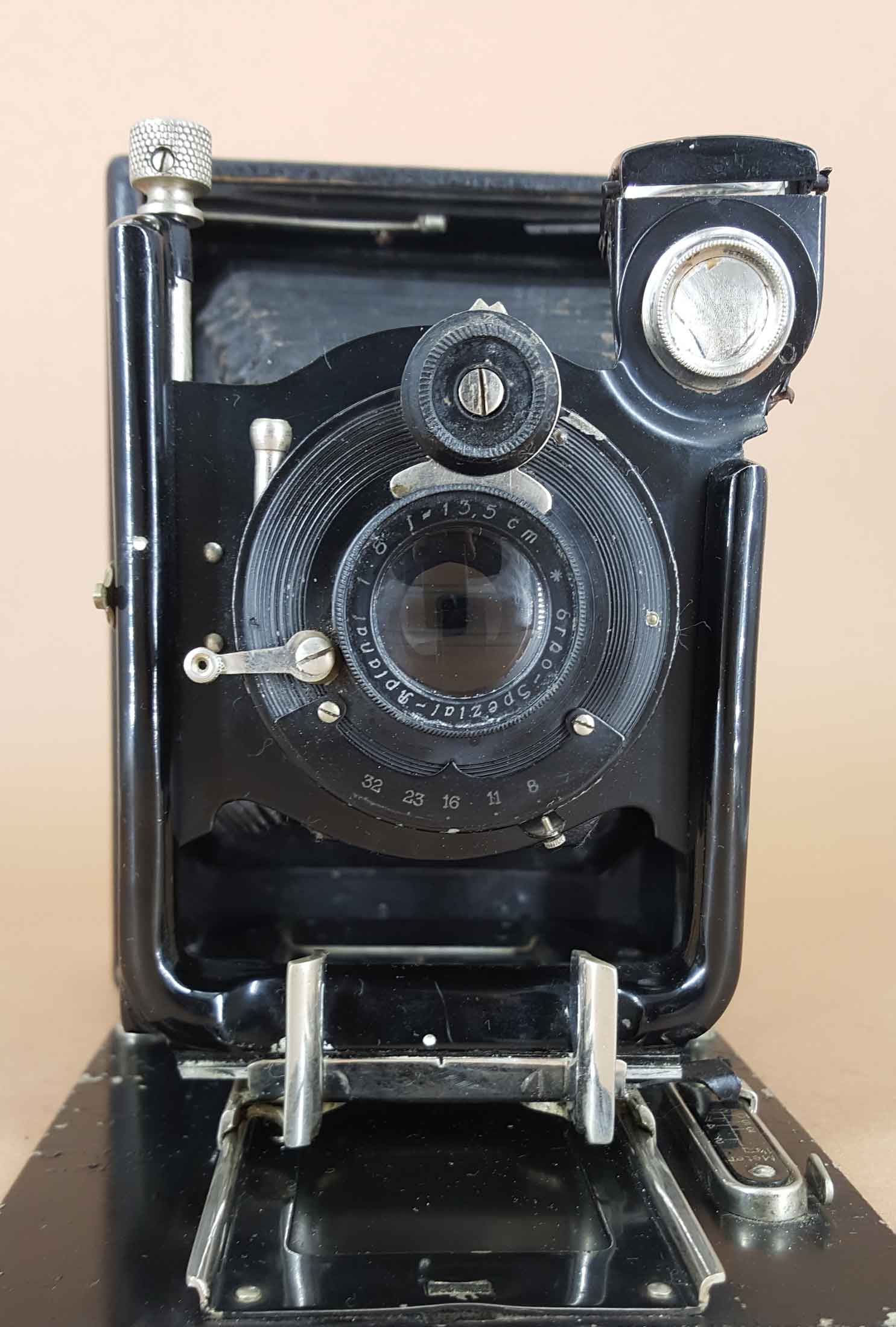 Art: faltbare Laufbodenkamera für Platte/Planfilm (Aufnahmeformat: 90 x 120 mm) Objektiv: Erko Spezial-Aplanat 13,5 cm f/8 F Verschluss: ähnlich Vario, Z-B-25-50-100, mit Drahtauslösergewinde Blende: 8, 11, 16, 23, 32 Fokussierung: Standarte über Laufboden verschiebbar; 1,2 Meter bis unendlich Gehäuse: Holzgehäuse mit schwarzem Lederbezug Sucher: offener Brillantklappsucher drehbar sonst. Ausstattung: 2mal Stativgewinde 3/8 Zoll, Metalllaufboden, Trageschlaufe (nur noch Halterung vorhanden), einfacher Auszug, Einstellskala mit Unendlichkeitsanschlag, Holzmattscheibenrahmen, Objektivträger seitlich und höhenverschiebbar Bemerkungen: Firmenschild an der Gehäuseinnenseitenwand Maße, Gewicht: ca. 170 x 125 x 55 mm, 675 g Baujahr: um 1923