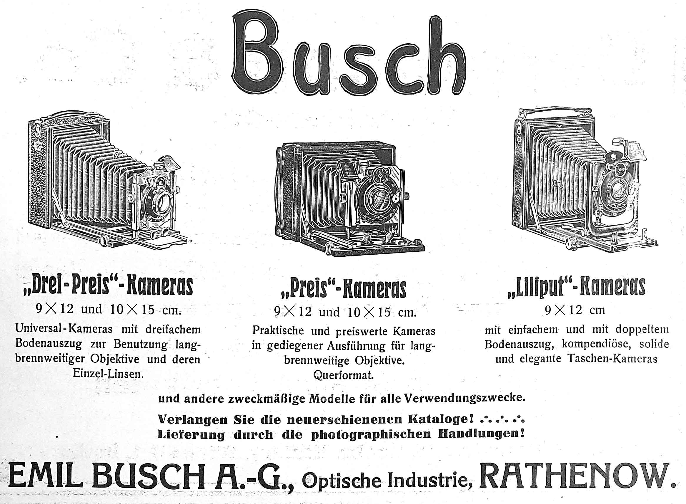 Preis-Kamera Querformat 10x15 1. Hersteller & Vertrieb • Fertigung: Gebrüder Herbst, Görlitz • Vertrieb: Emil Busch AG, Rathenow • Bezeichnung: Preis-Camera bzw. Drei-Preis-Camera im Busch-Katalog • Datierung: ca. späte 1890er bis frühe 1910er Jahre • Besonderheit: Viele Herbst-Kameras wurden von Busch unter eigenem Namen vertrieben; Prägungen fehlen gelegentlich, obwohl die Konstruktion eindeutig Herbst-Merkmale zeigt.