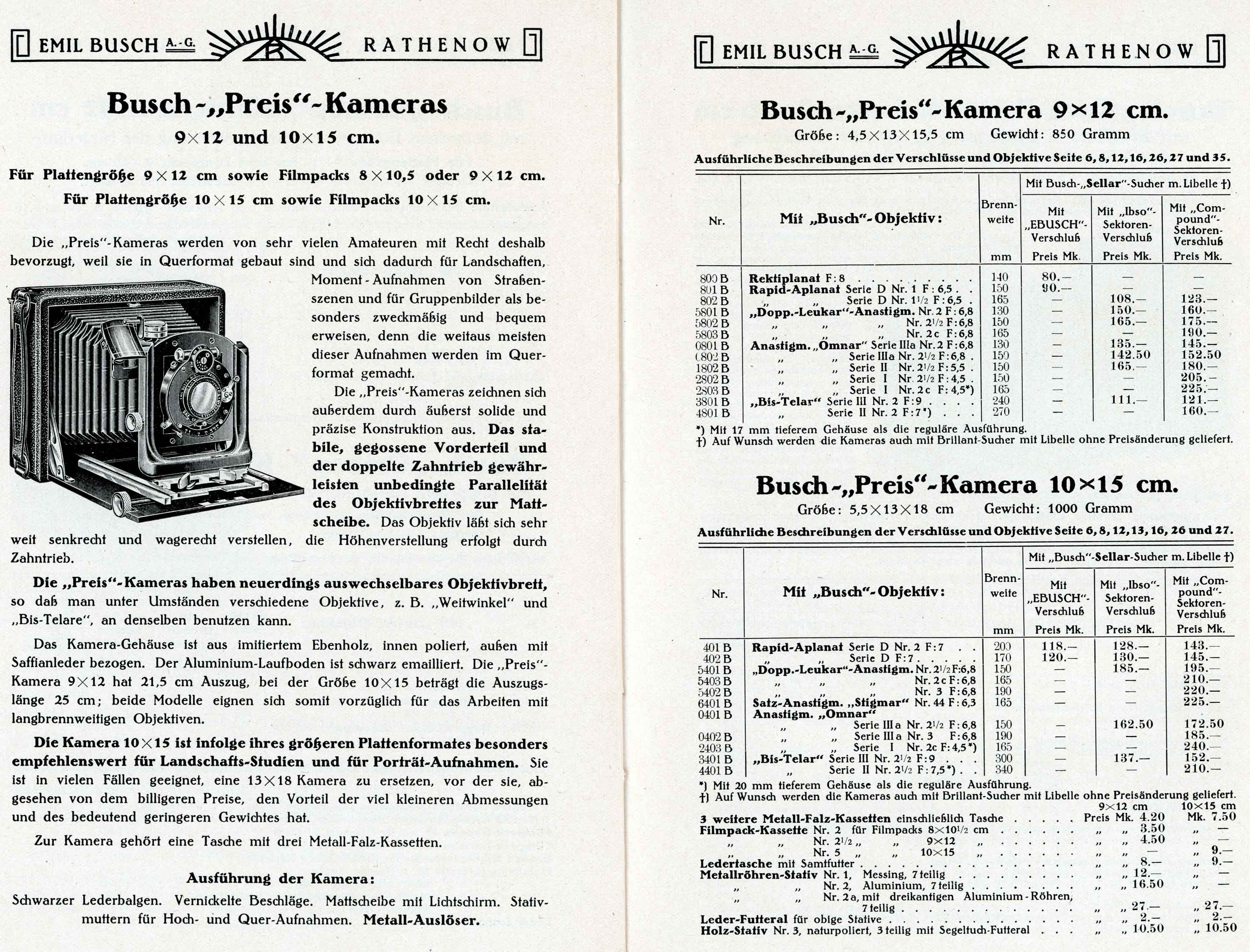 Deine schöne Kamera ist also eine Busch Preis-Kamera. Ab 1912/13 besaß die Preis-Kamera ein wechselbares Objektivbrett. Eine solche Preiskamera ist hier zu sehen: https://www.engel-art.ch/busch-emil/