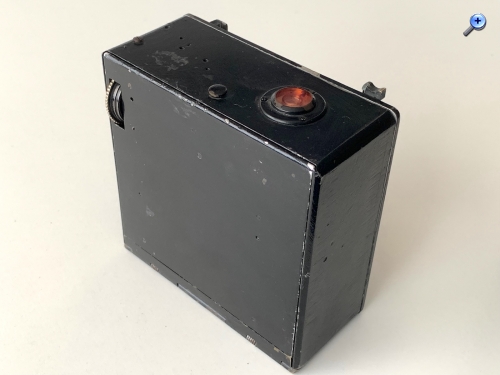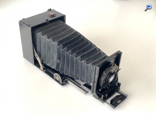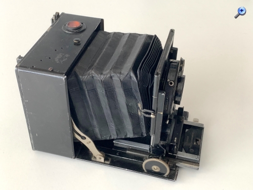 Es handelt sich um eine Laufbodenkamera in quadratischer Bauform für das Format 6,5x9. Das Rückteil ist dementsprechend drehbar. Die Kamera besitzt dreifachen Auszug; die Entfernungseinstellung erfolgt über einseitigen offenliegenden Zahntrieb. Auffällig ist die Entfernungsskala direkt am groß dimensionierten Triebknopf, so etwas ist typisch für Perka-Kameras (https://blende-und-zeit.sirutor-und-comp...&thread=306).