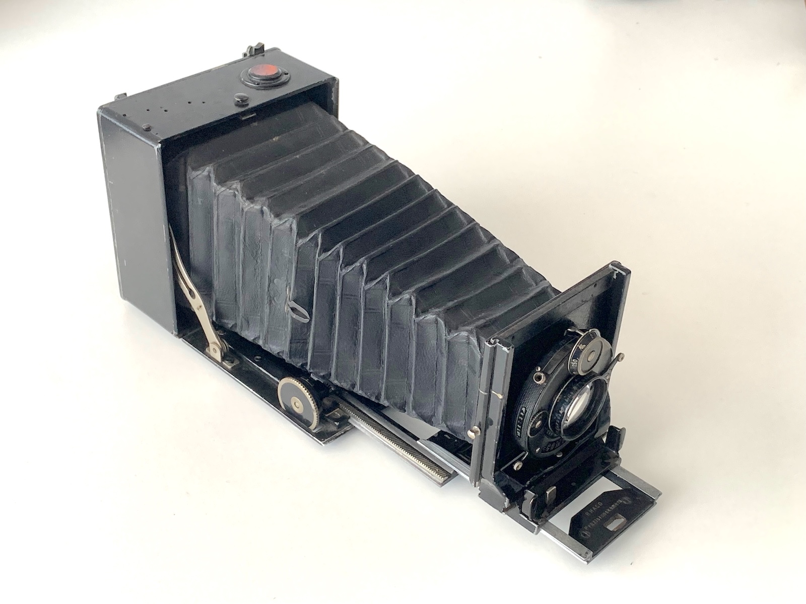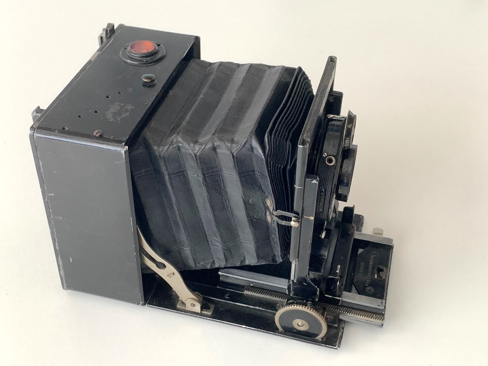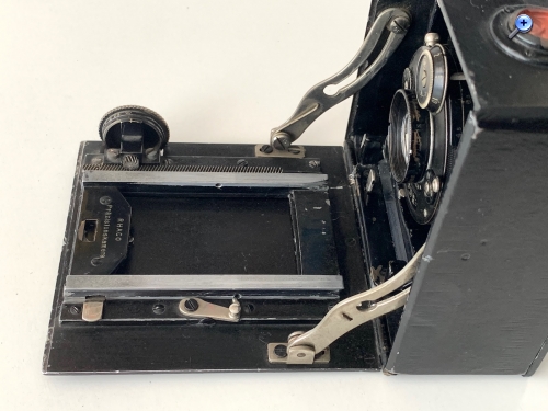 Das Mattscheibenrückteil fehlt leider, montiert war eine Rollex-Rollfilmkassette. Allerdings fehlt auch ein Sucher. Zuvor dürfte ein Newtonsucher wie beim Schweizer Vergleichsexemplar montiert gewesen sein, die Bohrungen auf der rechten Oberseite zeugen davon. Links davon befindet sich eine Dosenlibelle, die noch gefüllt ist. Bestückt ist die Kamera mit einem Schneider Xenar 4,5/12 von ca. 1921 in Rad-Compur, ebenfalls aus der Zeit um 1920. Ob das die originale Ausstattung ist, steht aber nicht fest. Das Objektivbrett ist ohnehin leicht wechselbar; es wird gegen eine Feder nach oben gedrückt und kann dann entnommen werden. Falls es sich um die ursprüngliche Bestückung handelt, können die Seriennummern eine zeitliche Eingrenzung der Kamera ermöglichen. Eine Seriennummer am Gehäuse habe ich bislang nicht entdecken können. Eine Datierung um 1920/21 scheint mir mit Blick auf die Gestaltung der Laufschienen und des Zahntriebs durchaus plausibel.
