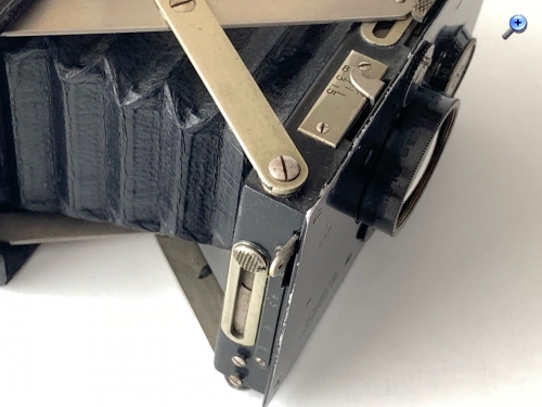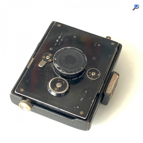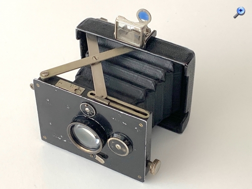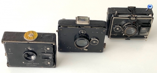 Von den Abmessungen (Geh. zusammengelegt: 9,5 x 7,5 x 3,3 cm) und dem Bedienkonzept her ähnelt die Makina am ehesten der Goerz Westentaschen-Tenax. Die hat aber den Vorteil, noch taschentauglicher zu sein, weil sie keine vorstehenden Bedienungselemente besitzt. Die Makina trägt immerhin weniger dick auf als die zeitgenössische Ica Bébé 40/2 (--> https://blende-und-zeit.sirutor-und-comp...&thread=415), obwohl ihr Mattscheibenrückteil recht dick ist.
