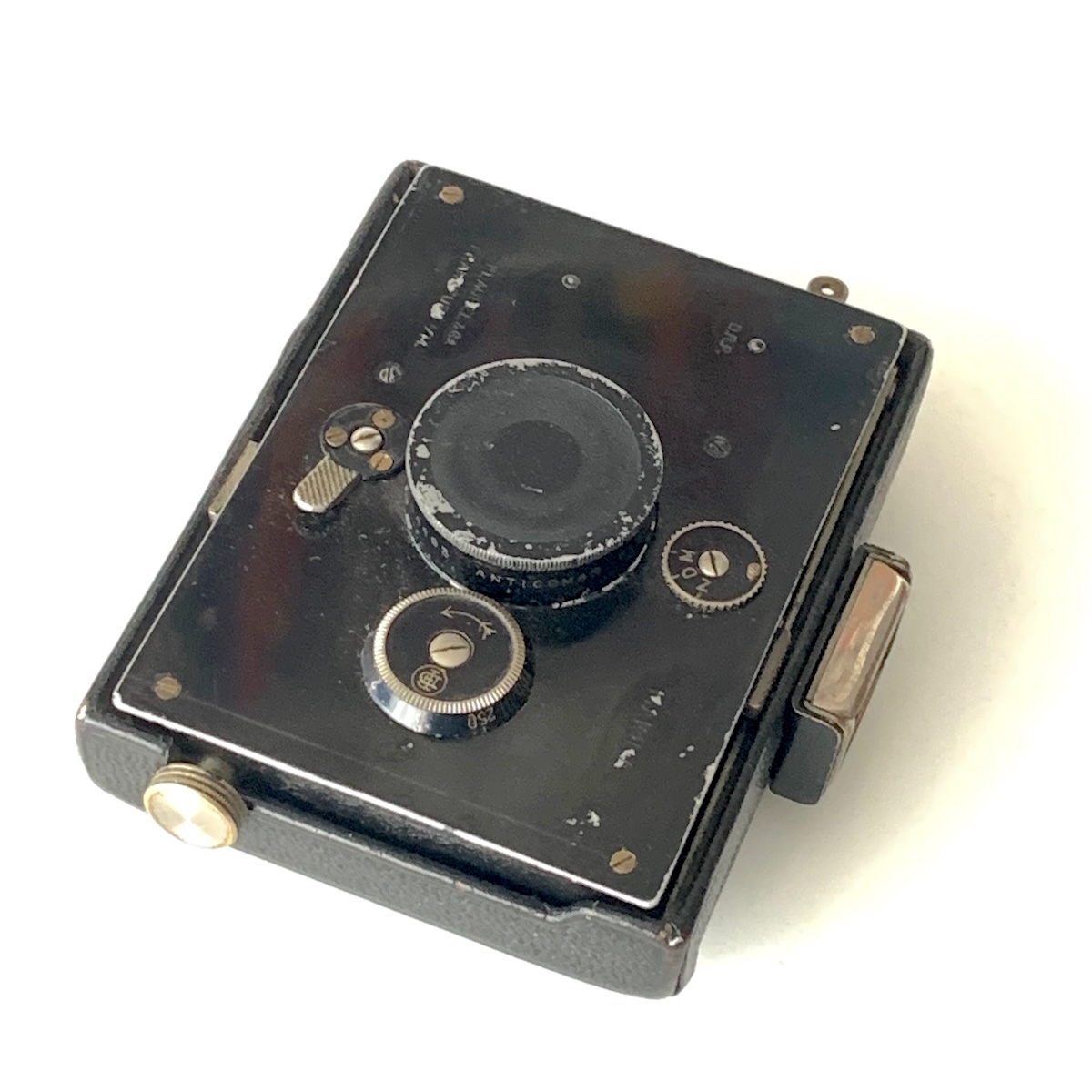 Die Frontplatte des vorliegenden Exemplars zeugt von ausgiebigem Gebrauch; technisch funktioniert alles. Und immerhin ist ein – wohl originaler – einschraubbarer Objektivdeckel vorhanden.