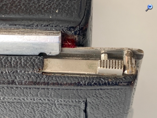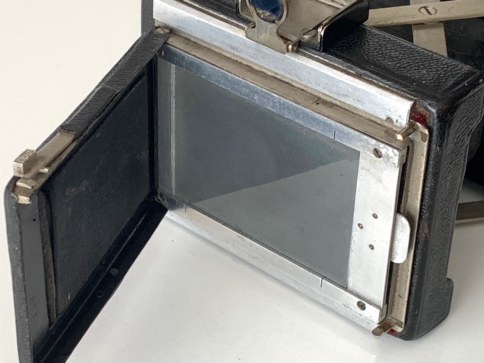 Dieses Rückteil wird übrigens nicht über einen Kassettenschieber am Gehäuse arretiert, sondern es besitzt selbst einen federnd gelagerten Stift zur Arretierung. Der Lichtschacht kann abgeklappt werden, wenn ein freier Blick auf die Mattscheibe gewünscht ist. In diesem Zusammenhang sei darauf hingewiesen, dass der Makina-Falz mit 61 mm vergleichsweise breit ist; Rückteile bzw. Kassetten anderer Hersteller passen nicht. Kross gibt an, der Falz weiche „absichtlich von der Norm ab, damit der Makina-Besitzer nicht minderwertige Blechkassetten benutzen kann, deren mangelhafte Präzision keine genaue Fokuslage der Aufnahmeschicht gewährleistet“ (S. 52).