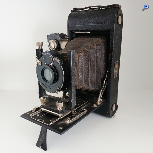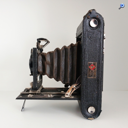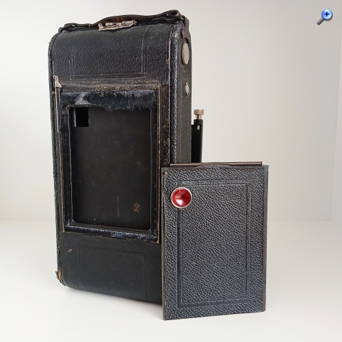 Es handelt sich um eine 116-Film-Kamera, also für ein Format von 6,5x11cm. Sie war auch für das größere Format von 8x10,5 verfügbar. Es ist sehr solide gebaut. Es hat einen robusten Holzkörper und eine sehr stabile Metallbasis. Es handelt sich jedoch nicht um eine Kamera mit hohen technischen Leistungen. Das Gehäuse der Kamera ist nicht aus echtem Leder, sondern aus synthetischem Material. Der massive und schwer aussehende eiserne Objektivträger schützt im Inneren den Mechanismus, um das Ziel in die Höhe zu heben, jedoch nicht horizontal. Es fehlen Referenzen von ihrem Hersteller mit Ausnahme des versteckten Logos, das auf dem letzten Foto zu sehen ist.