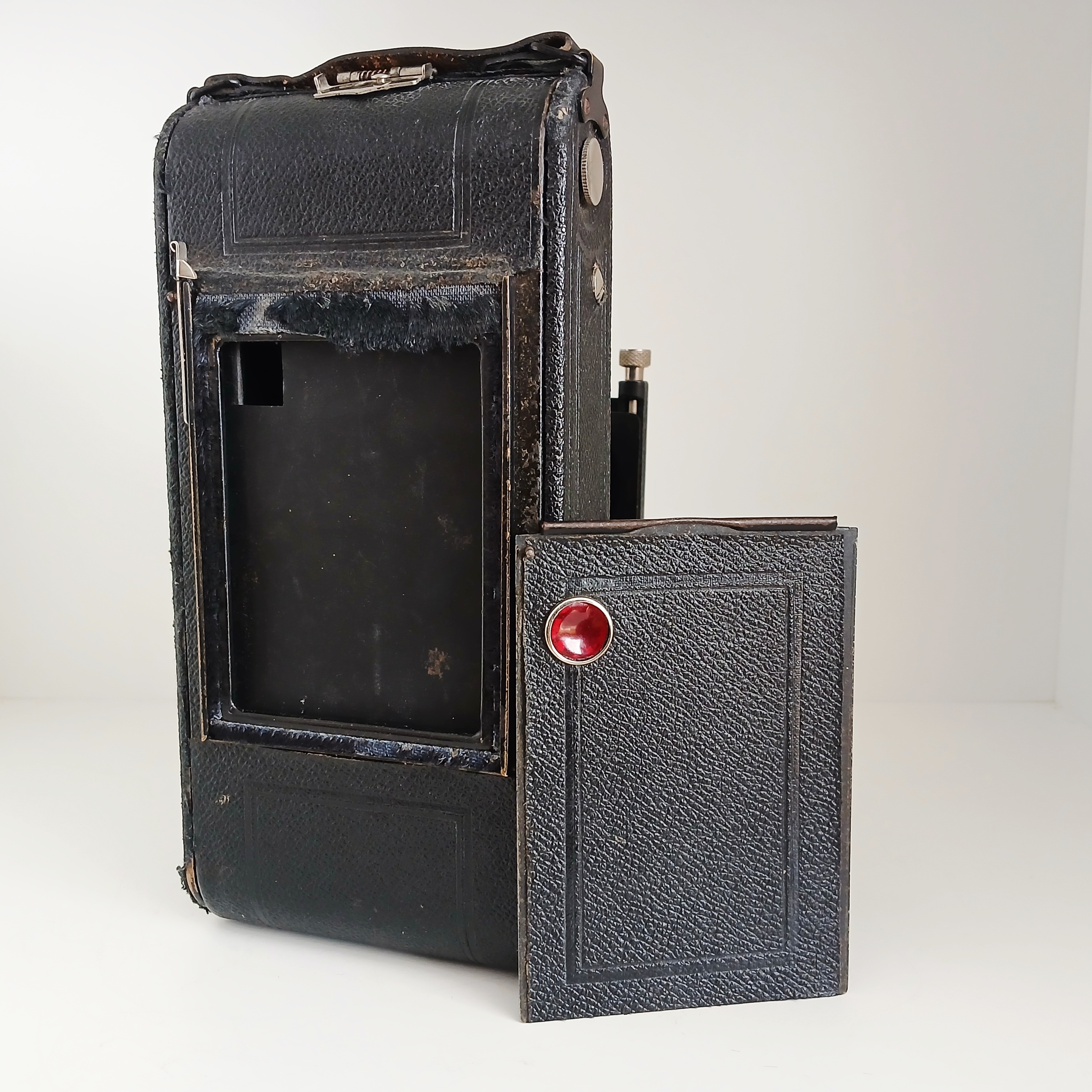 Wie üblich war die Kamera für den Einsatz mit Platten oder Film-Packs vorbereitet. Dazu muss das hintere Element entfernt werden, um die entsprechende Stütze einzubauen, die natürlich separat als Extra verkauft wurde. Außerdem muss das innere Blech entfernt werden, das den Durchgang der Folie schützt. Die Funktion des Verschlusses und der Blende sind korrekt. Allerdings weist der Balg Bohrungen und einige offensichtliche Materialverluste und Abnutzungen auf.