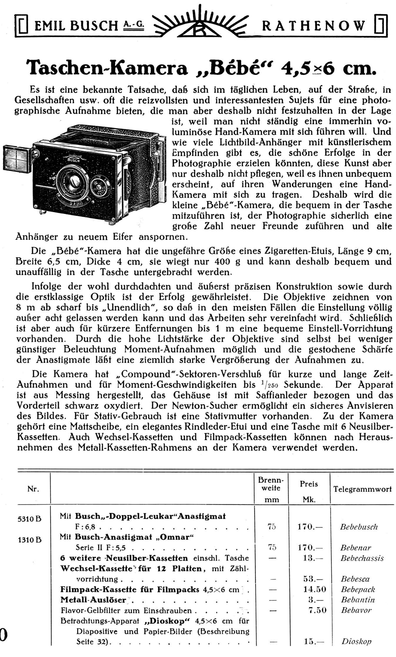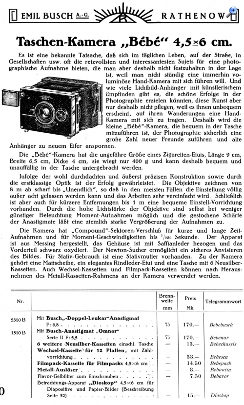 Dein Foto beweist jedenfalls, dass die Bébé 40 auch von Busch vertrieben und entsprechend gelabelt wurde (wie auch mein oben verlinktes Polyscop). Die Bébé besitzt einen Schneckengang, einen Compound-Verschluss sowie den ebenfalls bei Hanneke genannten Newtonsucher. Und: Die angegebenen Maße stimmen exakt! Die Bébé mit Tessar ist etwas schwerer als die angegebenen 400 g, aber ihr Objektiv ist ja auch lichtstärker als ein Aplanat 6,8 – auch das sollte also passen. Zur endgültigen Bestätigung wäre eine zeitgenössische Anzeige oder ein Busch-Katalog erforderlich. (Manchmal sind es ja Zufallsfunde; ich habe etliche Bücher mit dickem Anzeigenanhang, es ist nur etwas mühselig, alles durchzusehen...).