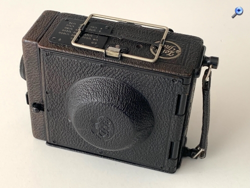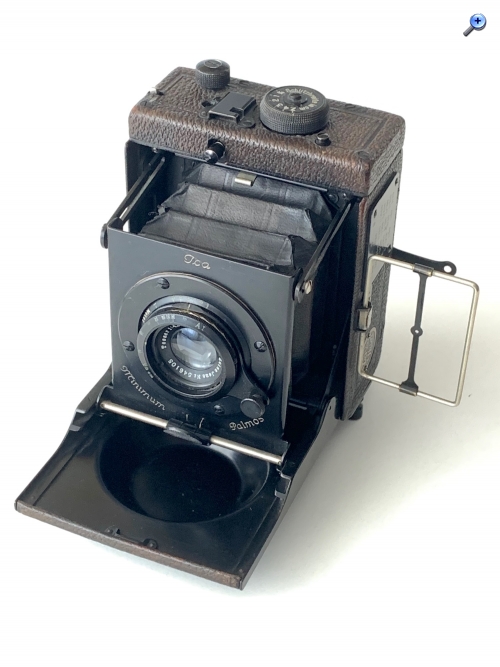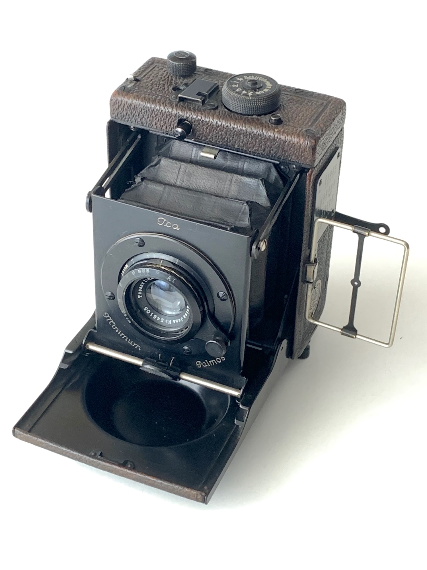 Es ist die kleinste Version der Minimum-Palmos-Serie (--> https://blende-und-zeit.sirutor-und-comp...&thread=125): eine Spreizenkamera mit Schlitzverschluss für Platten im Format 4,5x6. Anders als die größeren Modelle besitzt sie einen klappbaren Boden, der die Spreizen zusätzlich stabilisiert und bei Nichtgebrauch das Objektiv schützt. Die große Wölbung verrät, dass ein lichtstarkes Objektiv vorgesehen ist.