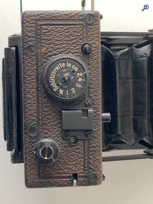 Die Verschlusssteuerung erfolgt über die Parameter Schlitzbreite (einzustellen auf dem Wählrad, mit dem auch der Verschluss gespannt wird; zum Verstellen wird der Kragen hochgezogen) und Federspannung (von 0 bis 9 über den kleinen Drehknopf einzustellen). Die Kombinationen sind auf der seitlichen Tabelle abzulesen, wobei mehrere Kombinationen möglich sind Für die Verschlusszeit 1/125 ist die Schlitzbreite 1 cm mit der Federspannung Stufe 0 zu wählen; das gleiche Ergebnis erhält man Schlitzbreite 2 cm und Federspannung 5. Die Tabelle enthält nur Zeiten für die Federspannungsstufen 0, 5 und 9, die anderen Werte lassen sich aber ebenfalls einstellen. Mit dem kleinen Hebel lässt sich die Feder wieder entspannen. Wie präzise der Verschluss seinerzeit gearbeitet hat und ob sich der Unterschied zwischen 1/100 und 1/125 bemerkbar gemacht hat, lässt sich nicht mehr sagen. Der Verschluss läuft noch, die Genauigkeit ist wohl nicht mehr gegeben.