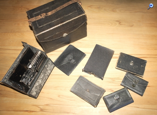 Meine Erinnerungen an die Taschen für Großformat(platten)kameras reichen da bis in die frühen 60er Jahre zurück. Die Taschen waren quaderförmig aus hartem Leder oder aus mit Kunstleder bezogenem Holz mit einem Fach für die zusammengekappte Kamera und einem Fach für die Plattenkassetten.