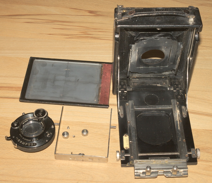 Vielleicht war's in einer Übergangszeit, und deshalb der Adapter für Million- bzw. Packfilmkassetten einerseits und andererseits der, der für den Mattscheibenhalter und möglicherweise erst später für Agfakassetten verwendet wurde, dabei.